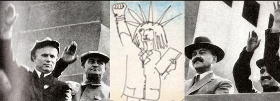 Sokan e tárgykör kutatói közül e gondolatok megfogalmazásában egy korábbi emberbódító eszme, a szabadkőművesség istentagadó szellemét vélik felfedezni, legalábbis annak azt az ágát, amely később egyenesen sátánista tanoknak lett az előfutára. Az alábbi kép egy ilyen korai szabadkőműves beavatás egyik epizódját ábrázolja, amely már-már valóban kísértetiesen hasonlít az ikonikussá vált „No passaran!” spanyol köztársaságpártiak kommunista köszöntésére: