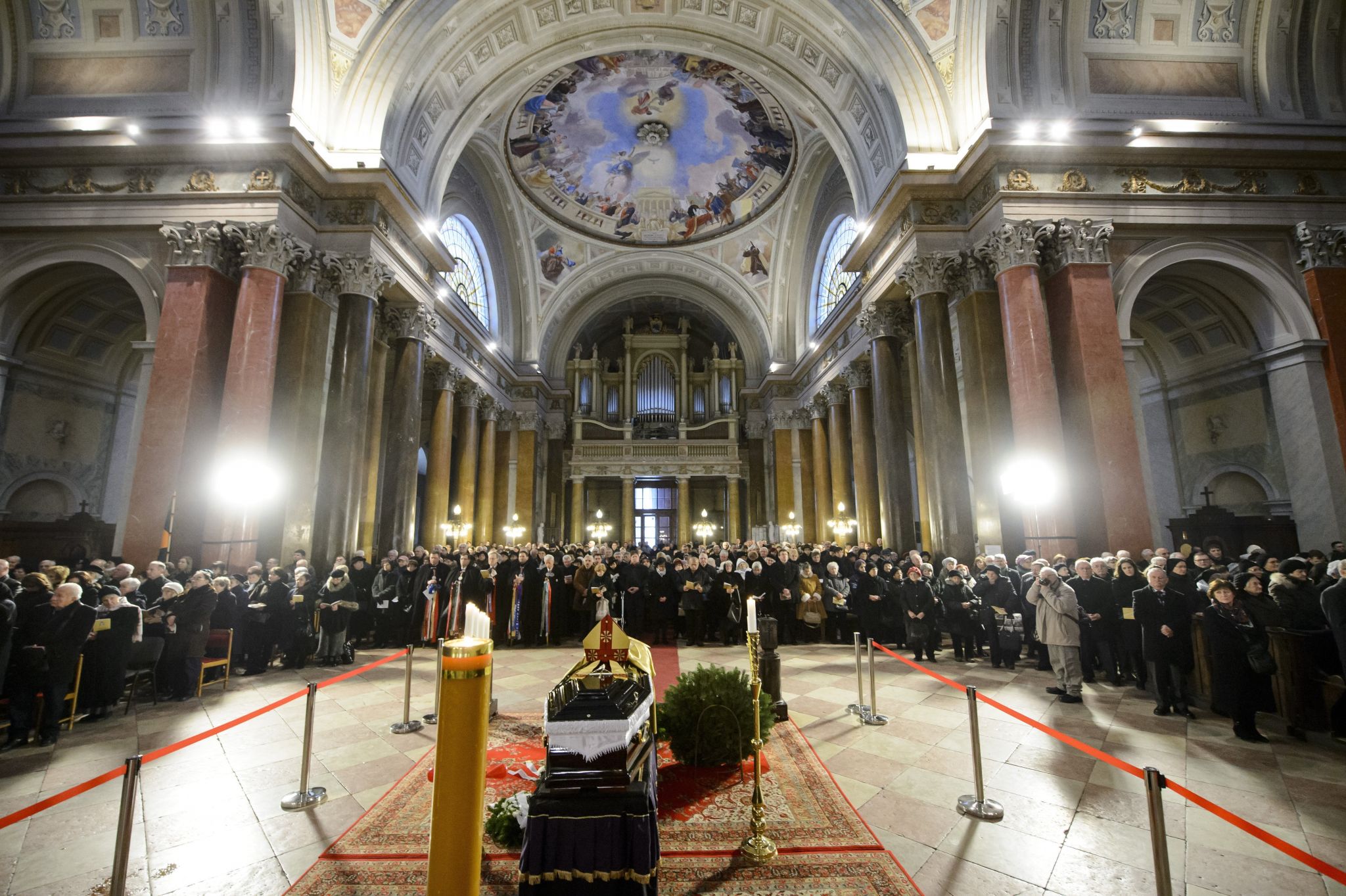 Orbán Viktor miniszterelnök (első sor b), mellette felesége, Lévai Anikó (b2), Semjén Zsolt nemzetpolitikáért, egyházügyekért és nemzetiségekért felelős miniszterelnök-helyettes (b3) és Latorcai János, az Országgyűlés kereszténydemokrata alelnöke (b4) Seregély István nyugalmazott egri érsek gyászszertartásán az egri fõszékesegyházban 2019. január 8-án. – MTI/Komka Péter