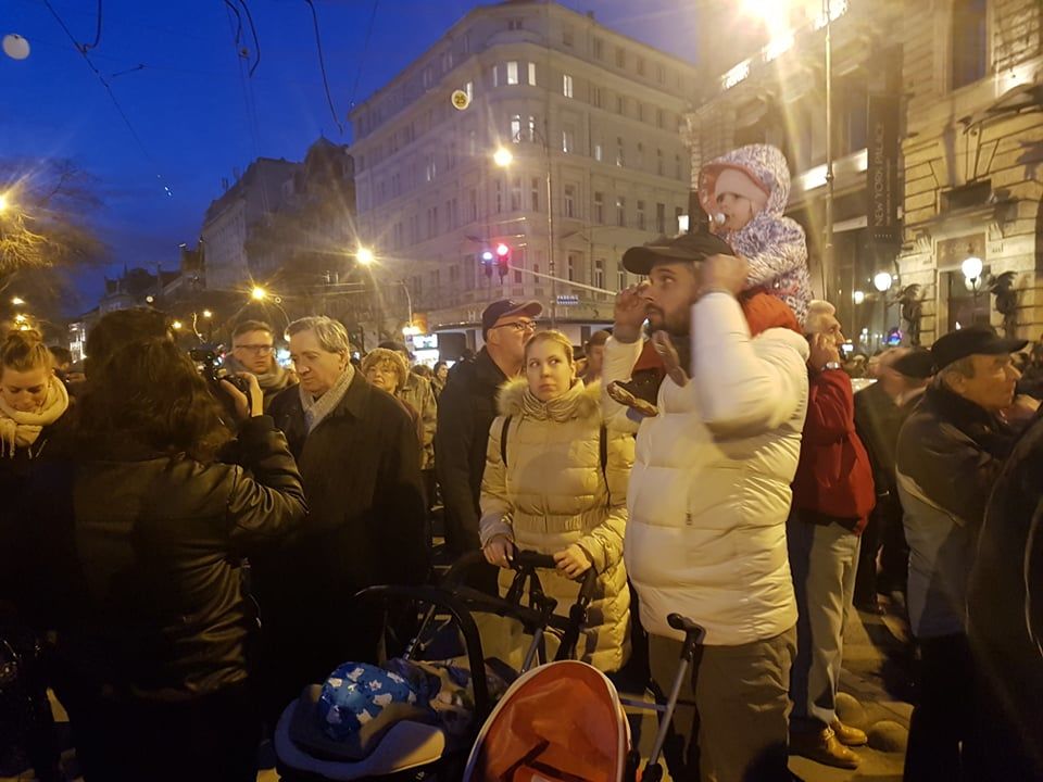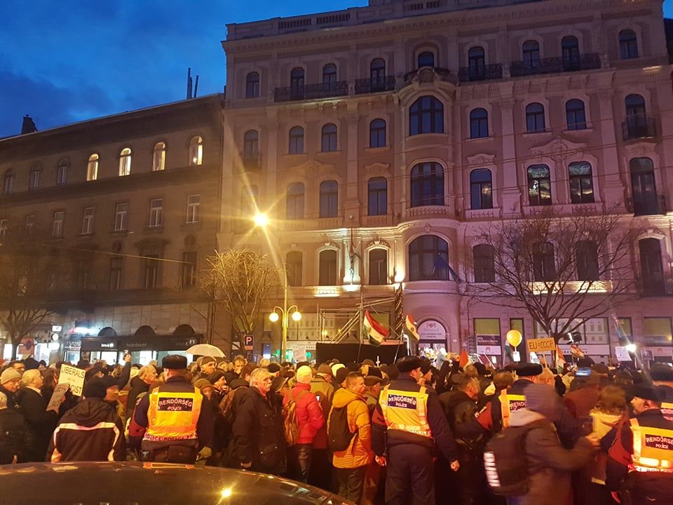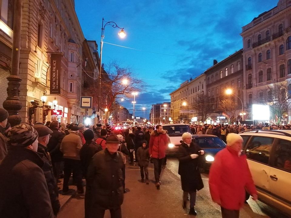 17:10 – A körút teljesen megbénult a tömeg miatt, a villamos nem jár egyik irányban sem. Közben a beszédekkel megkezdődött a demonstráció „hivatalos” programja is.