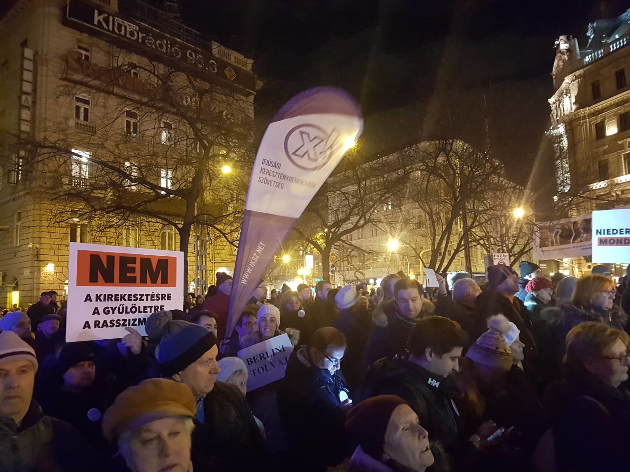 17:40 – Már Azbej Tristan államtitkár beszél a demonstrálókhoz. Arról szólt: korábban már üldözték a kommunisták a keresztényeket, napjainkban ugyanez történik. A tömeg szavaira ezzel reagál: „Nem hagyjuk!”