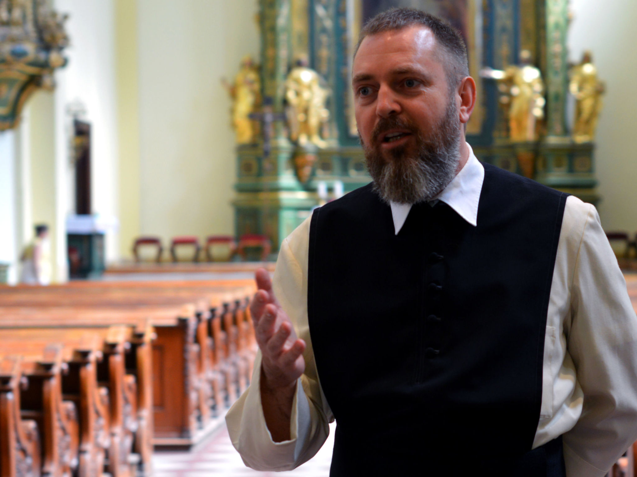 Szkaliczki Csaba Örs, a Budai Szent Imre Plébánia plébánosa fogadja a sajtó munkatársait (Fotó: Tóth Gábor, Vasárnap.hu)