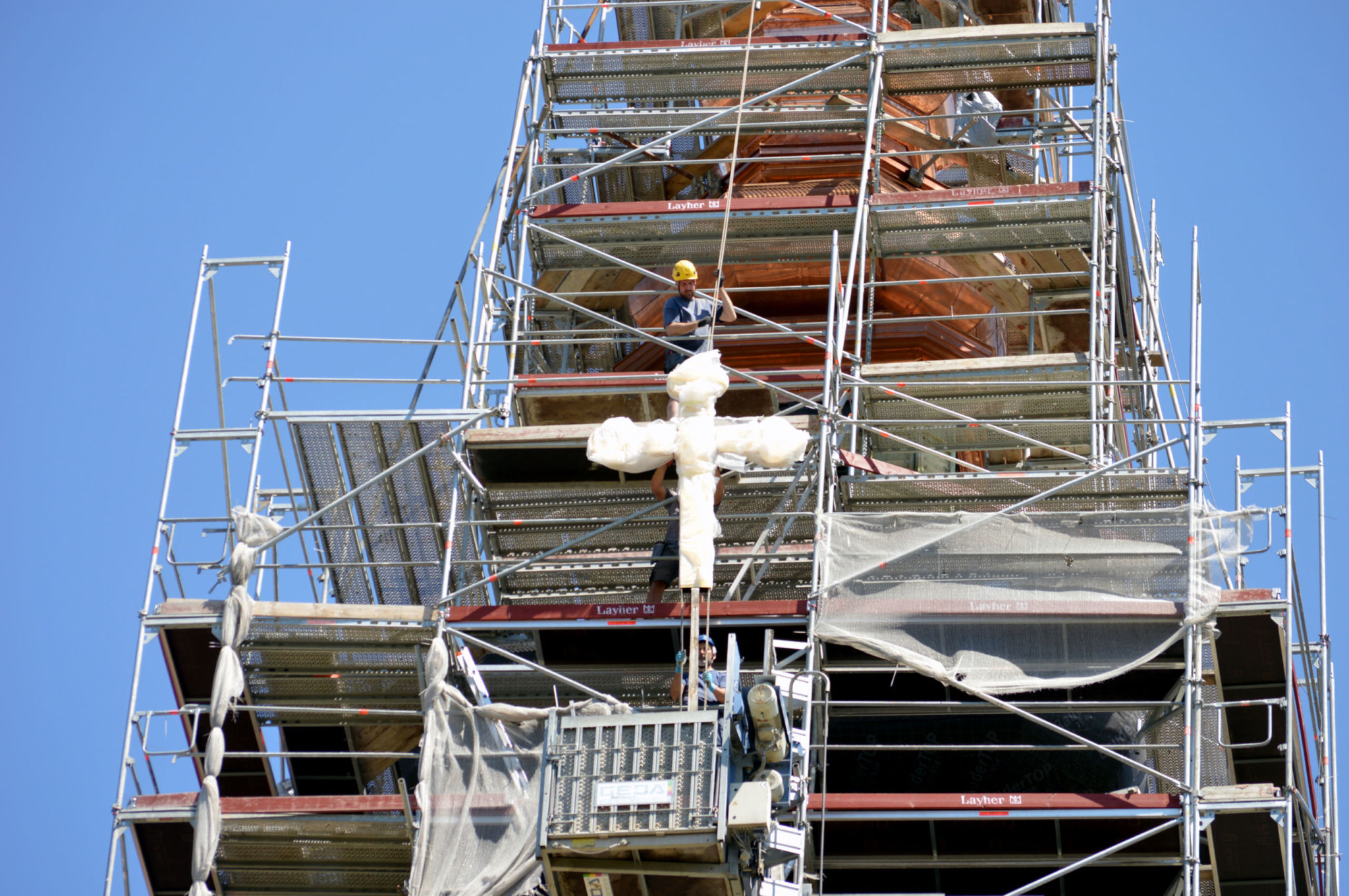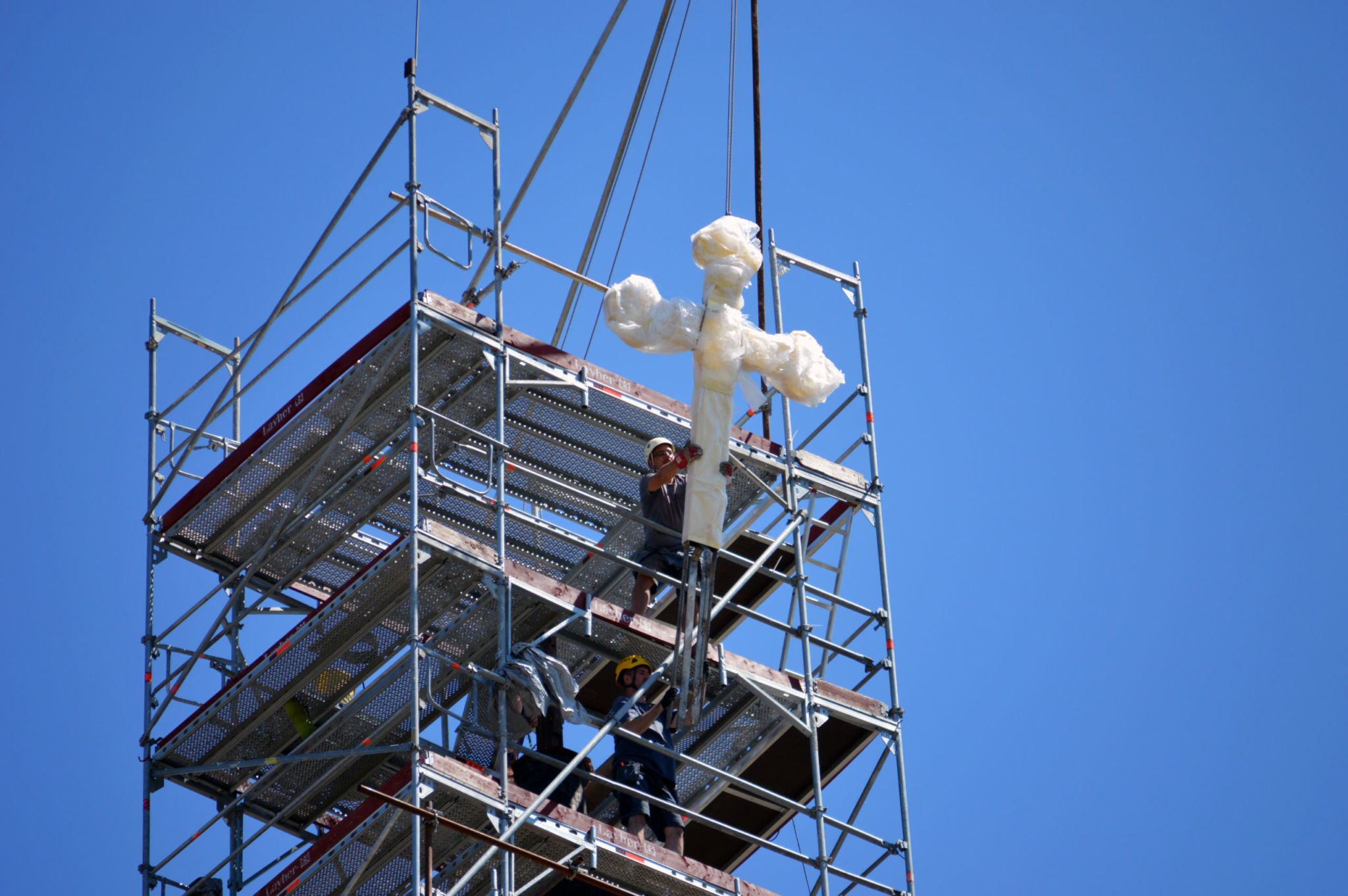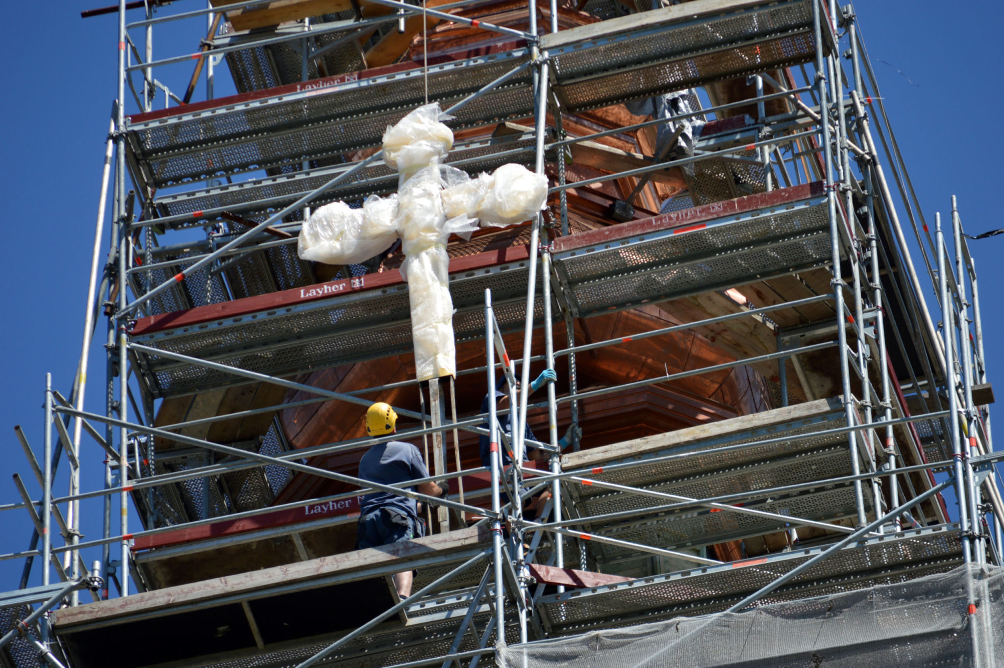 A templom keresztje gondos becsomagolás után kerül elhelyezésre (Fotó: Tóth Gábor, Vasárnap.hu)