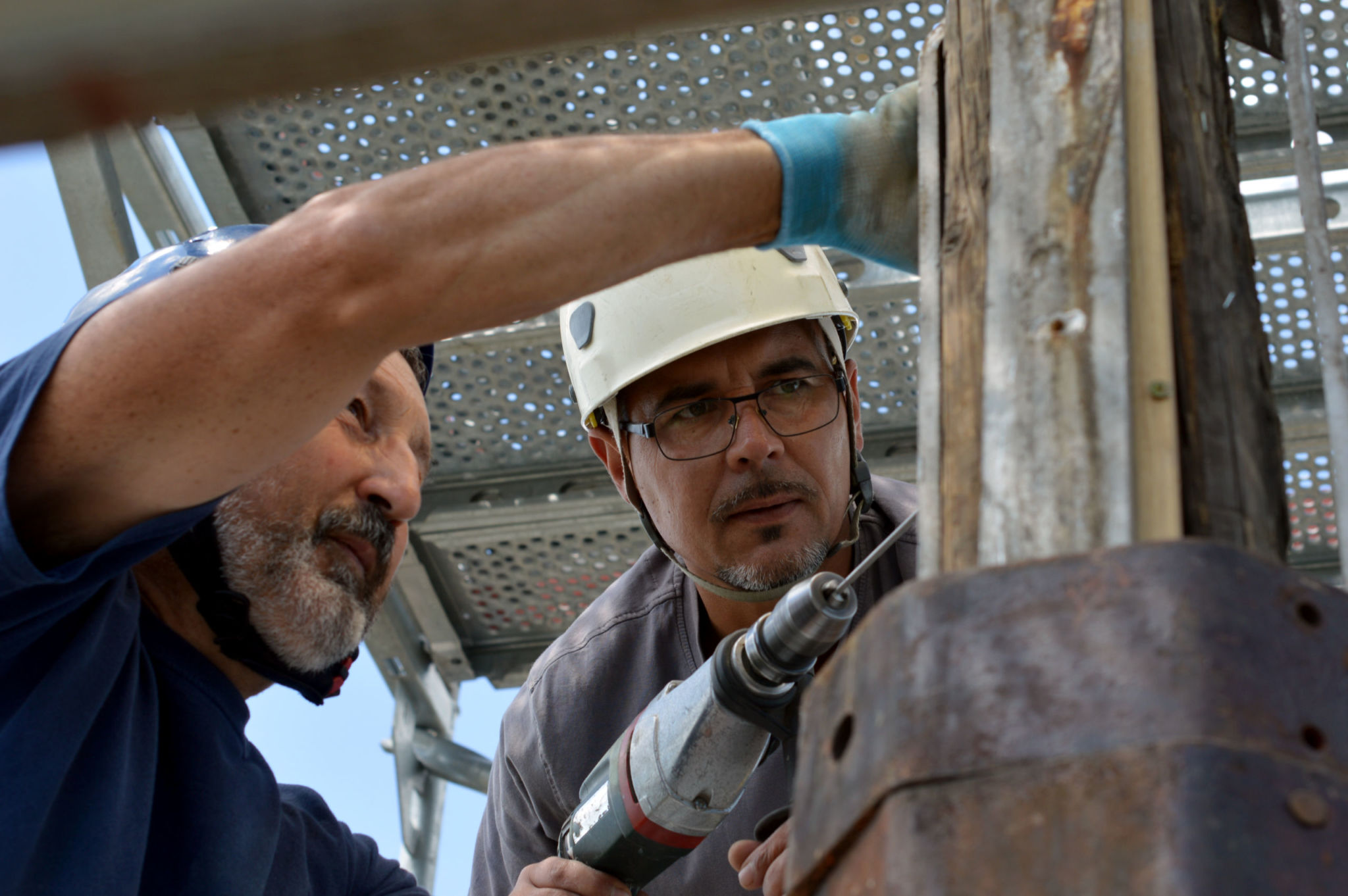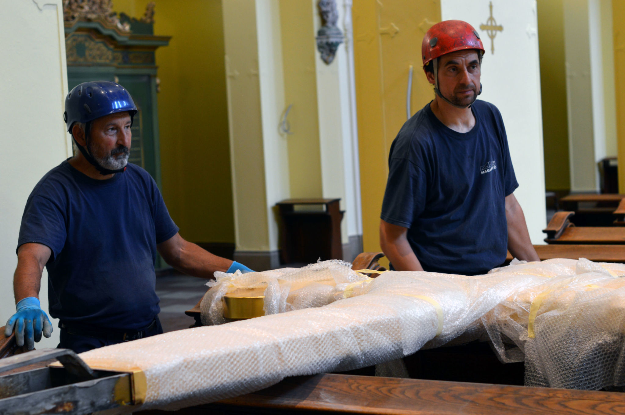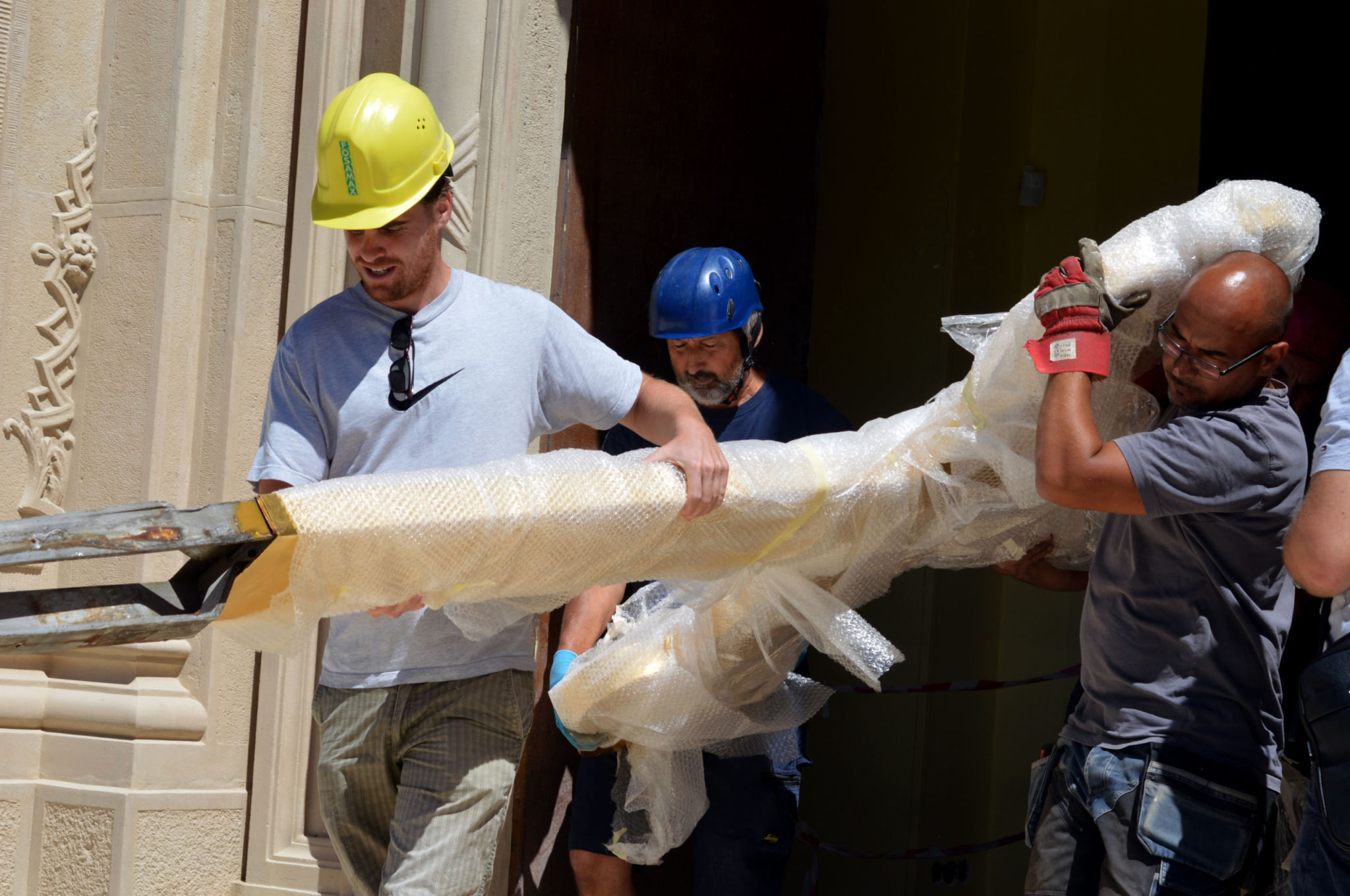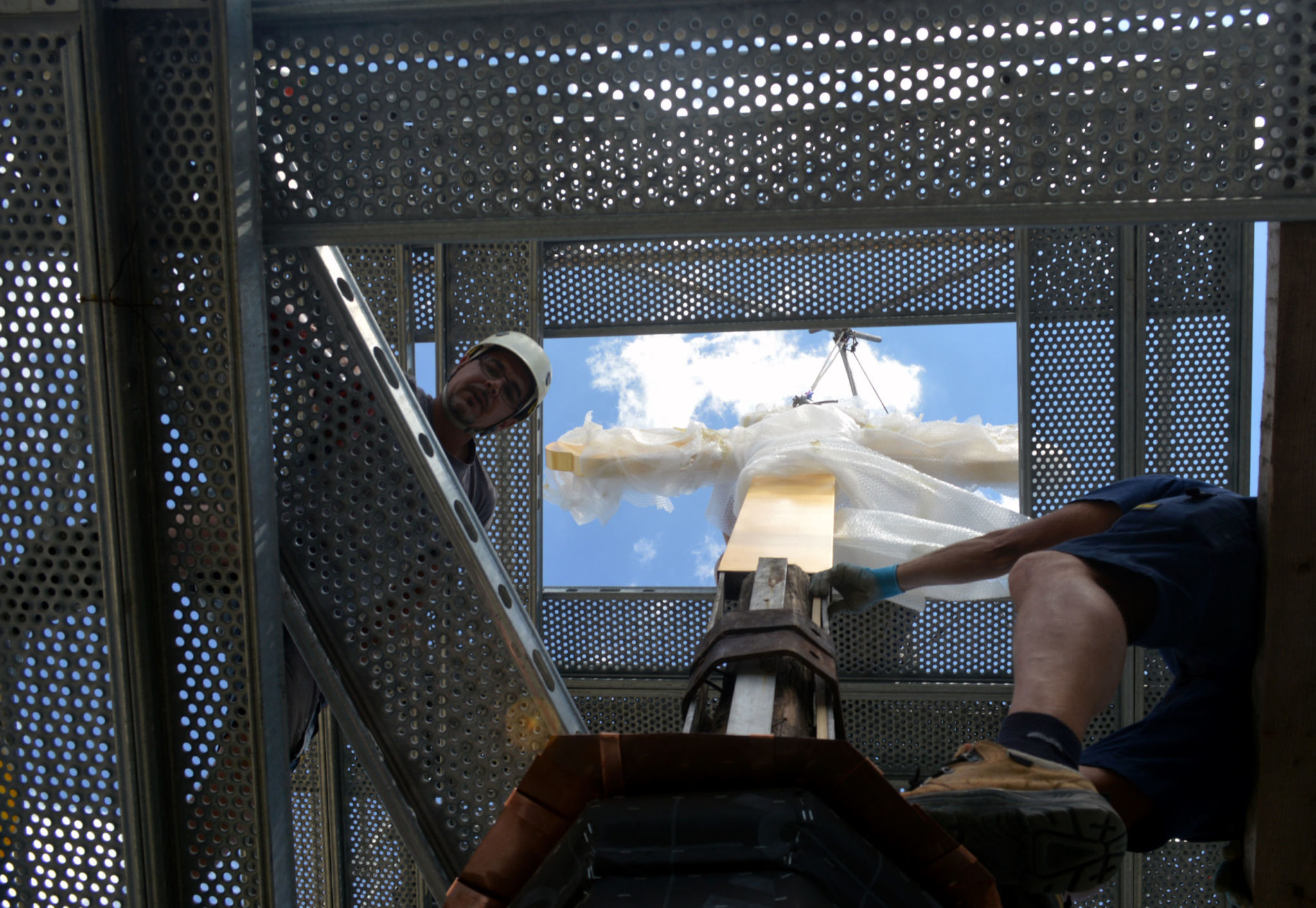 A templom keresztje gondos becsomagolás után kerül elhelyezésre (Fotó: Tóth Gábor, Vasárnap.hu)