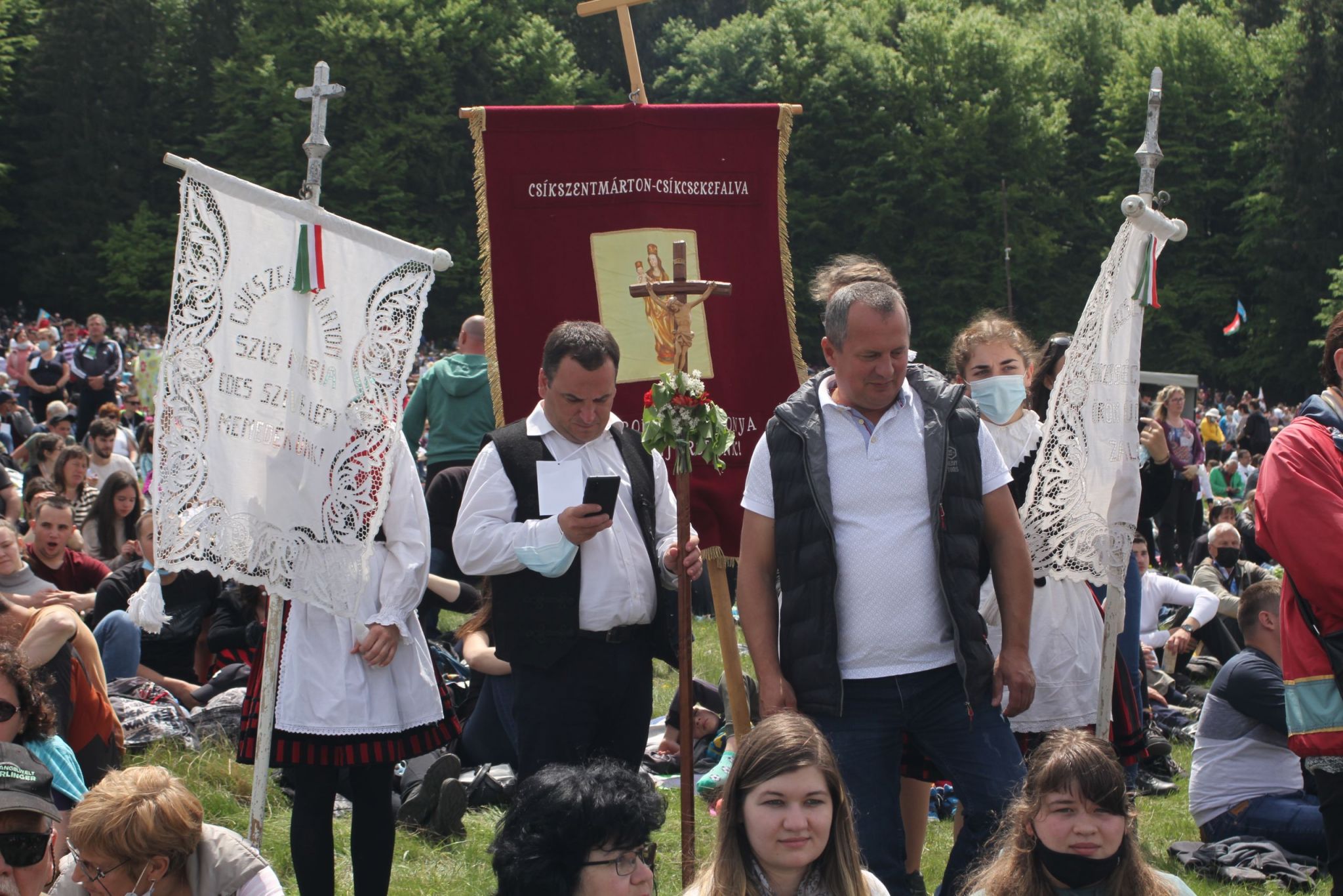 Salamon József megemlítette: a csíksomlyói zarándokok kereszt alatt, sokan vándorbottal a kezükben jöttek a hegynyeregbe.