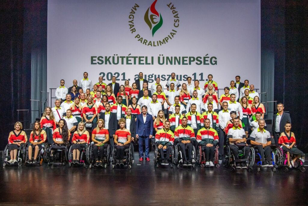 Kiemelt képünkön a tokiói paralimpián versenyző magyar csapat tagjai láthatók, középen Szabó László, Magyar Paralimpiai Bizottság elnöke (második sor) az eskütételi ünnepségen Budapesten, az Eiffel Műhelyházban 2021. augusztus 11-én. MTI/Balogh Zoltán