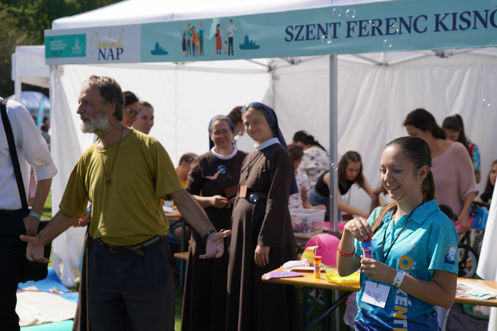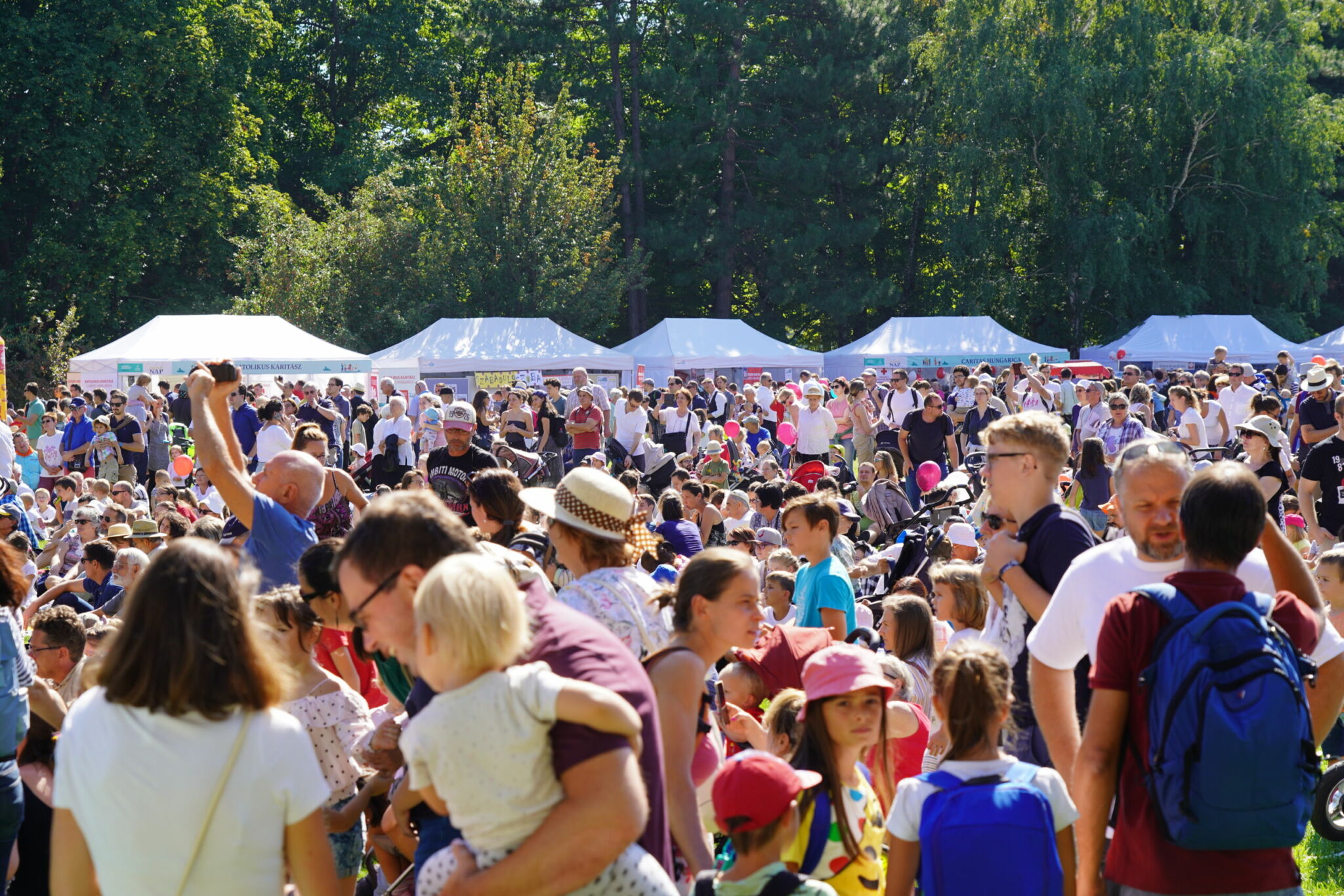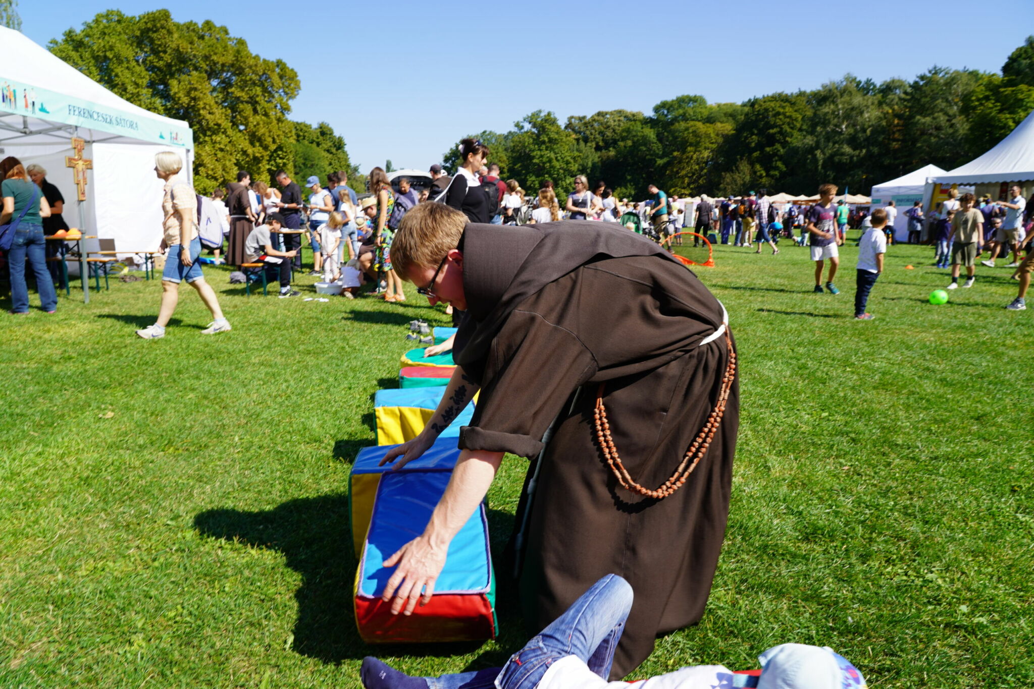 A szombati nap teljesen rácáfolt korábbi félelmeimre. A Margitsziget a részt vevő családok sokasága miatt feltehetőleg elbillent volna az egyik irányba, ha nem éppen a közepére esett volna a programok helyszíne – mondhatnám szellemesen. A katolikus társadalmi napok szervezésében megvalósuló komoly beszélgetéseknek, tanúságtételeknek, aktuális, családokat érintő társadalmi folyamatok elemzésének helyet adó, mintegy ezerfős sátor szünet nélkül megtelt érdeklődőkkel. A hatalmas mező kontúrjait kirajzoló fehér sátrakban pedig a katolikus egyházi közösségek, szerzetesrendek vonultak fel a családoknak szánt programokkal, játékokkal.