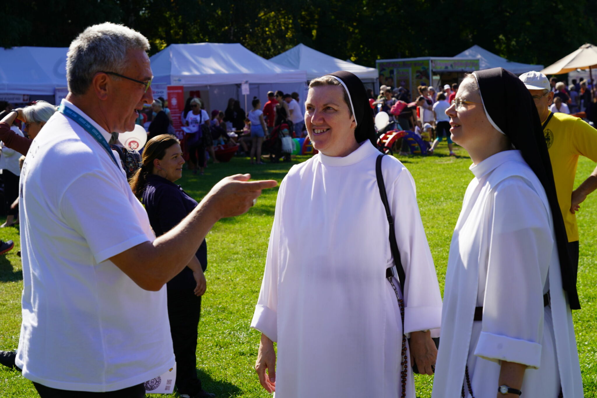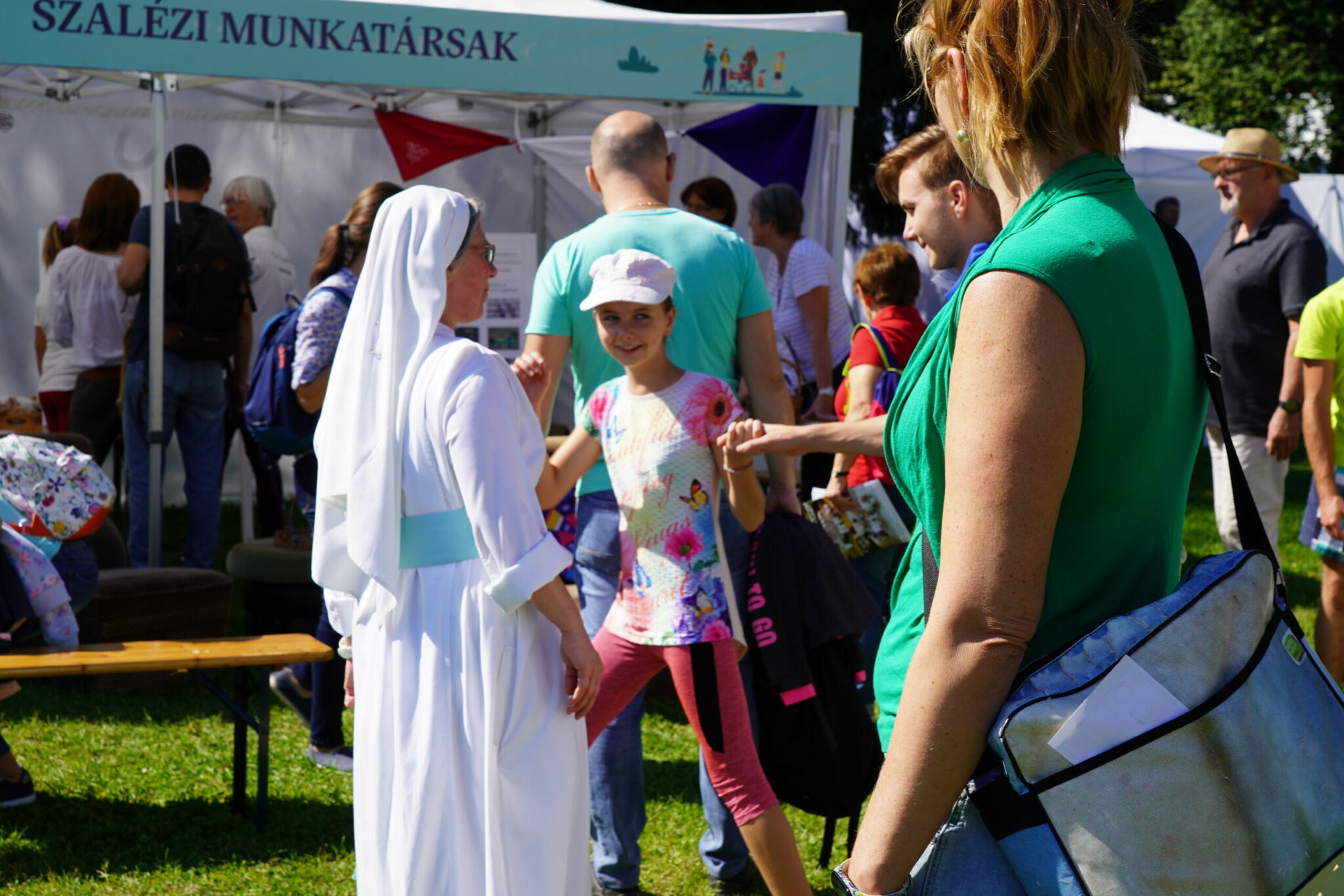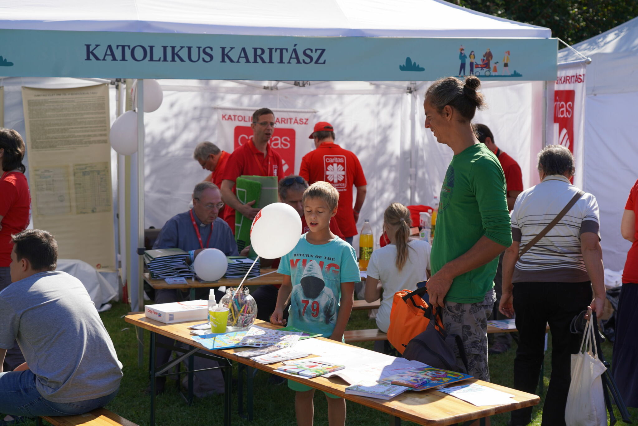 A szombati nap teljesen rácáfolt korábbi félelmeimre. A Margitsziget a részt vevő családok sokasága miatt feltehetőleg elbillent volna az egyik irányba, ha nem éppen a közepére esett volna a programok helyszíne – mondhatnám szellemesen. A katolikus társadalmi napok szervezésében megvalósuló komoly beszélgetéseknek, tanúságtételeknek, aktuális, családokat érintő társadalmi folyamatok elemzésének helyet adó, mintegy ezerfős sátor szünet nélkül megtelt érdeklődőkkel. A hatalmas mező kontúrjait kirajzoló fehér sátrakban pedig a katolikus egyházi közösségek, szerzetesrendek vonultak fel a családoknak szánt programokkal, játékokkal.