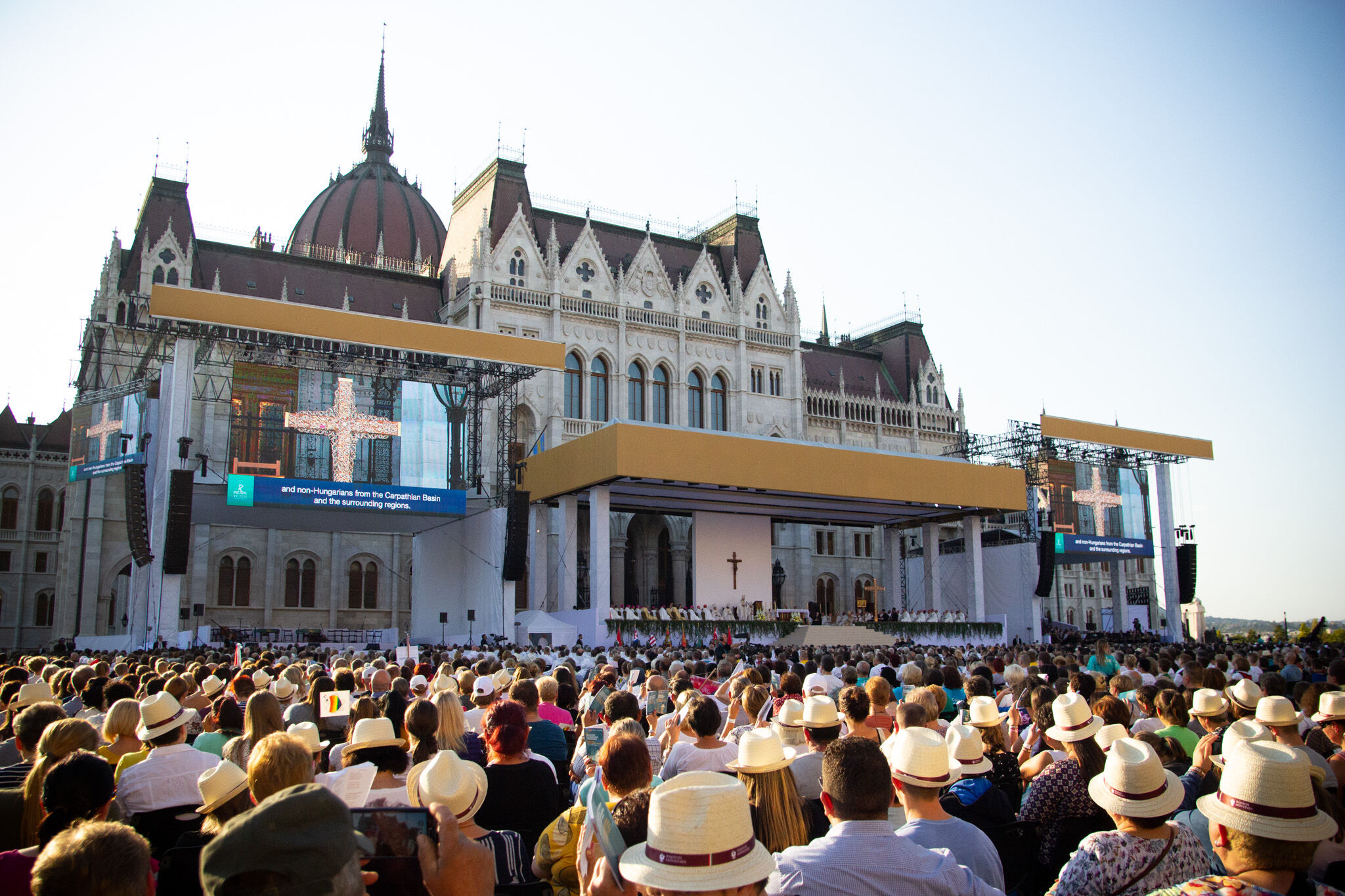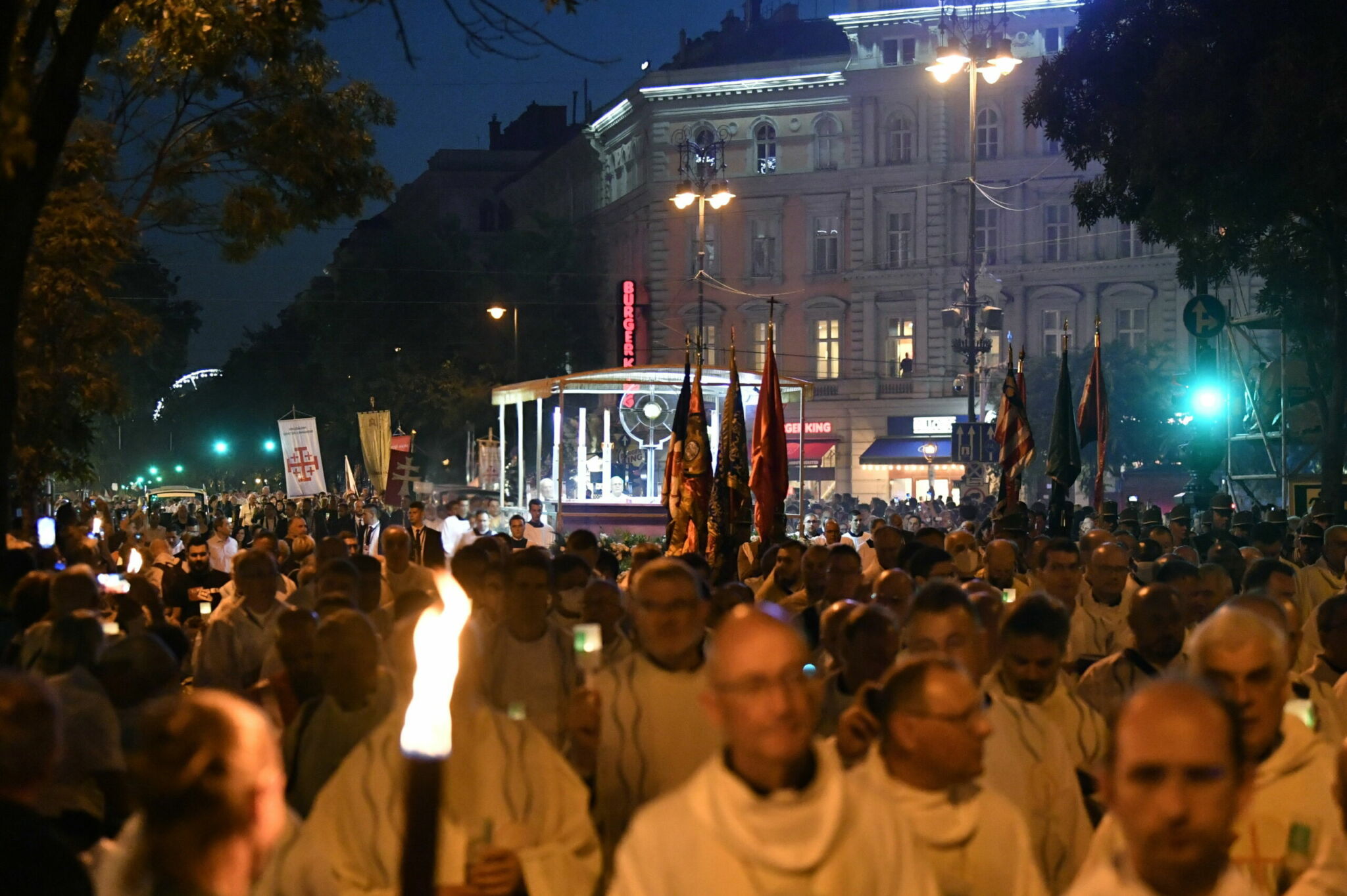 Az 52. Nemzetközi Eucharisztikus Kongresszus kiemelt eseményeként tartott gyertyás körmenet résztvevõi a Széchenyi István téren 2021. szeptember 11-én.MTI/Máthé Zoltán