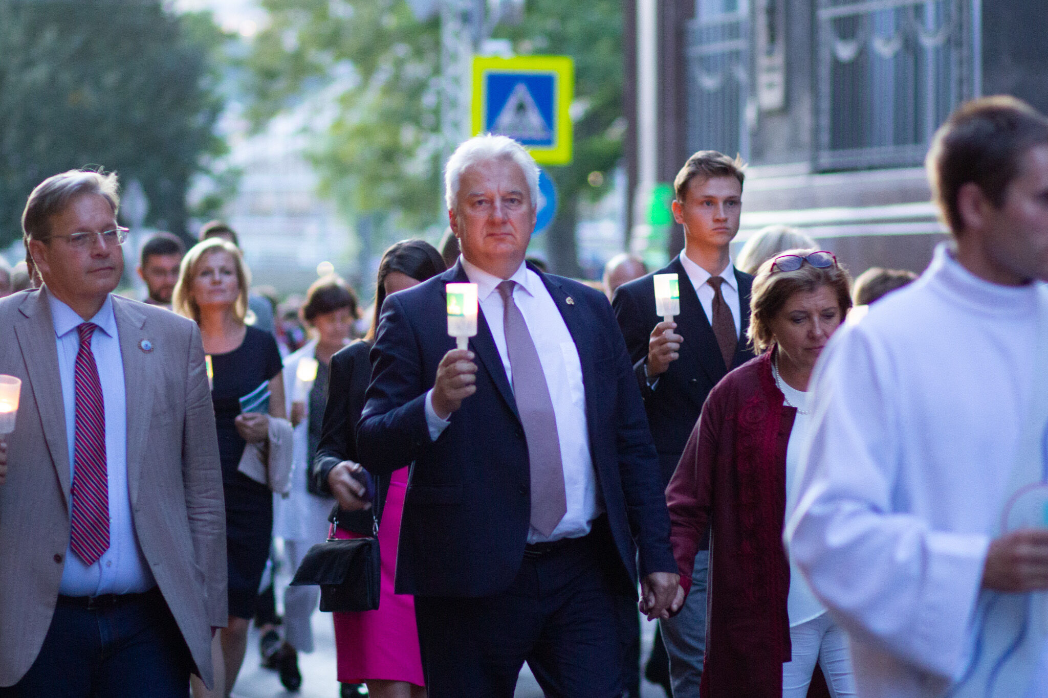A Miniszterelnökség által közreadott képen Semjén Zsolt miniszterelnök-helyettes (középen) az 52. Nemzetközi Eucharisztikus Kongresszus kiemelt eseményeként tartott gyertyás körmeneten 2021. szeptember 11-én.MTI/Miniszterelnökség/Botár Gergely