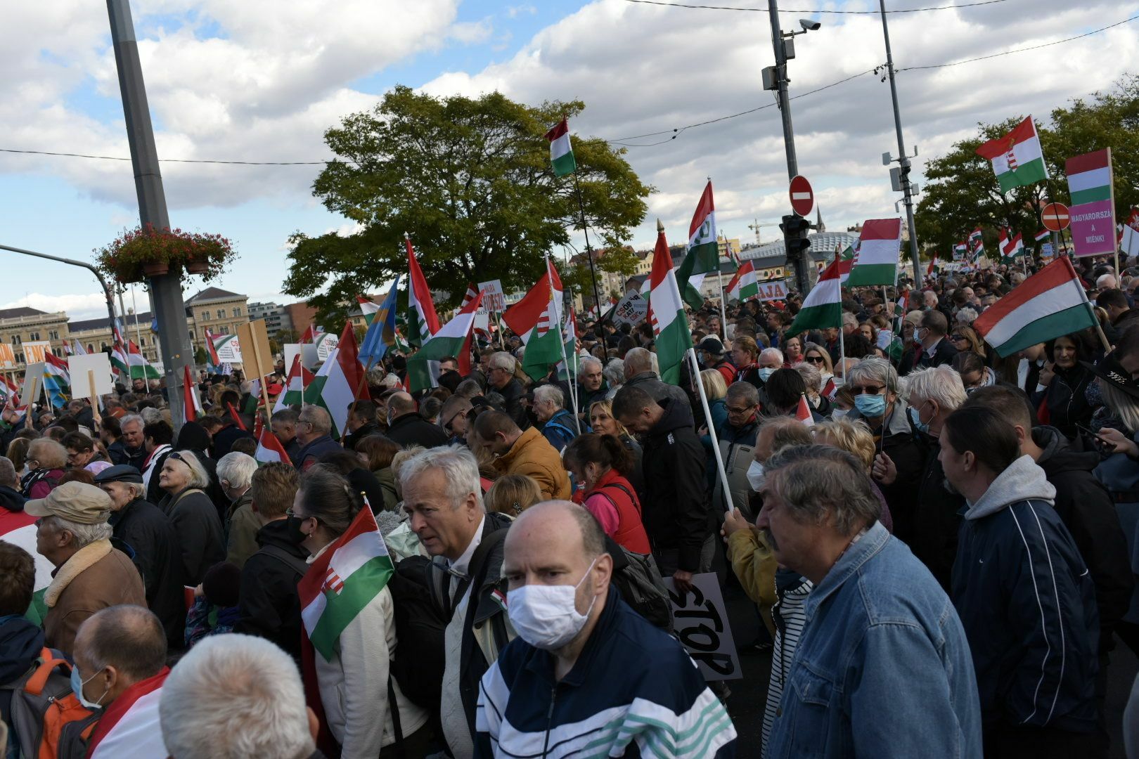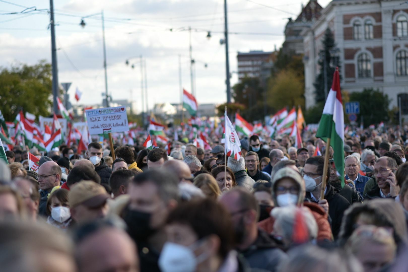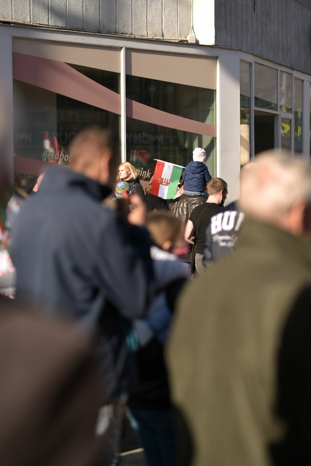 A résztvevők egy kifeszített molinó mögött sorakoztak fel, amelyen Gyurcsány Ferenc volt miniszterelnök arcképe, egy 2006-os lovasrohamot ábrázoló fotó és a „Soha többé!” szöveg szerepel.