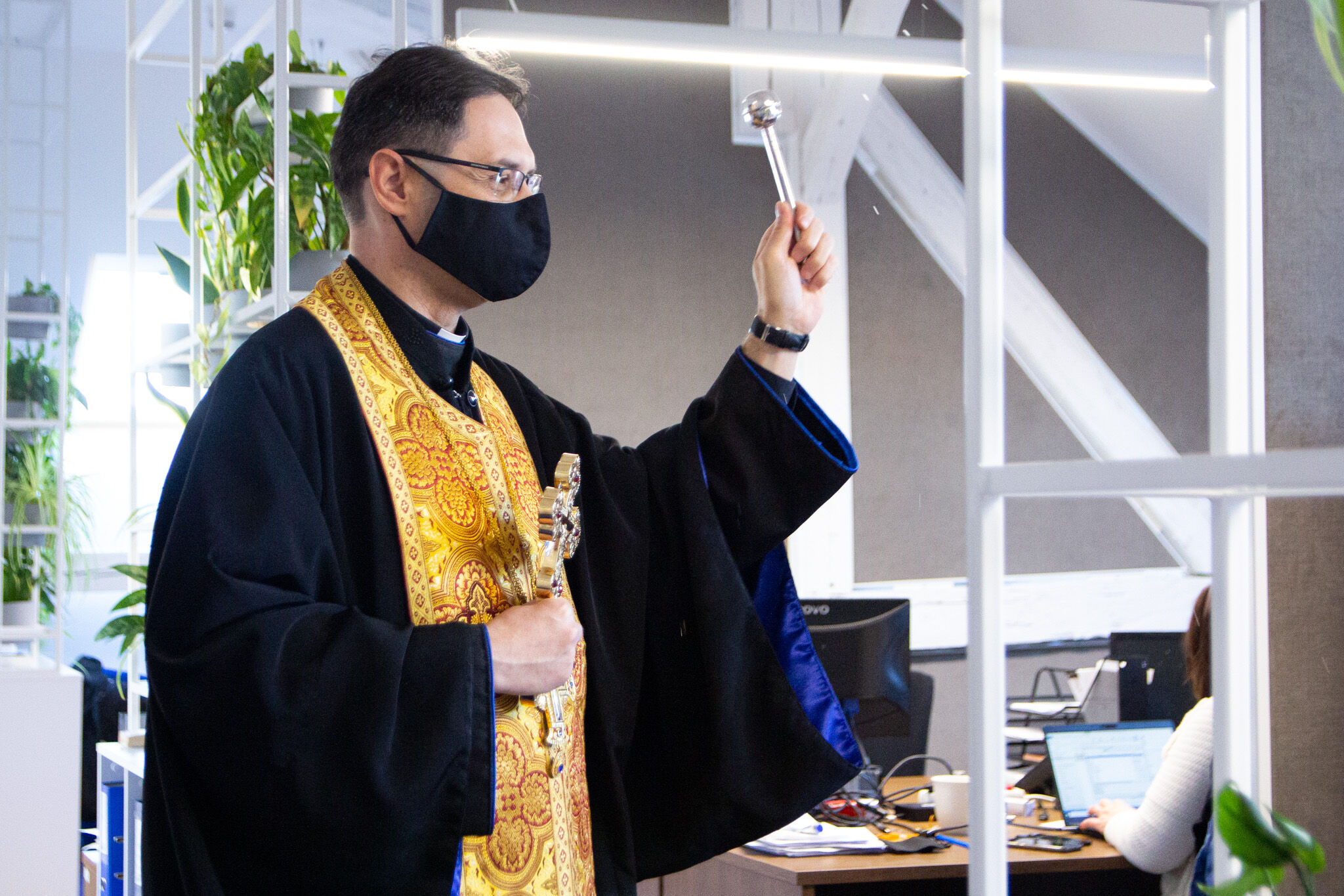 A házszentelés az államtitkárság kápolnájában kezdődött szerdán kora délután. Kiss Bertalan, a Miniszterelnökség Stratégiai Elemző és Külkapcsolati Főosztály vezetője átadott Makkai László atyának egy, a damaszkuszi szír pátriárka által megáldott keresztet. Az államtitkárság épületét László atya ezzel a kereszttel szentelte meg.