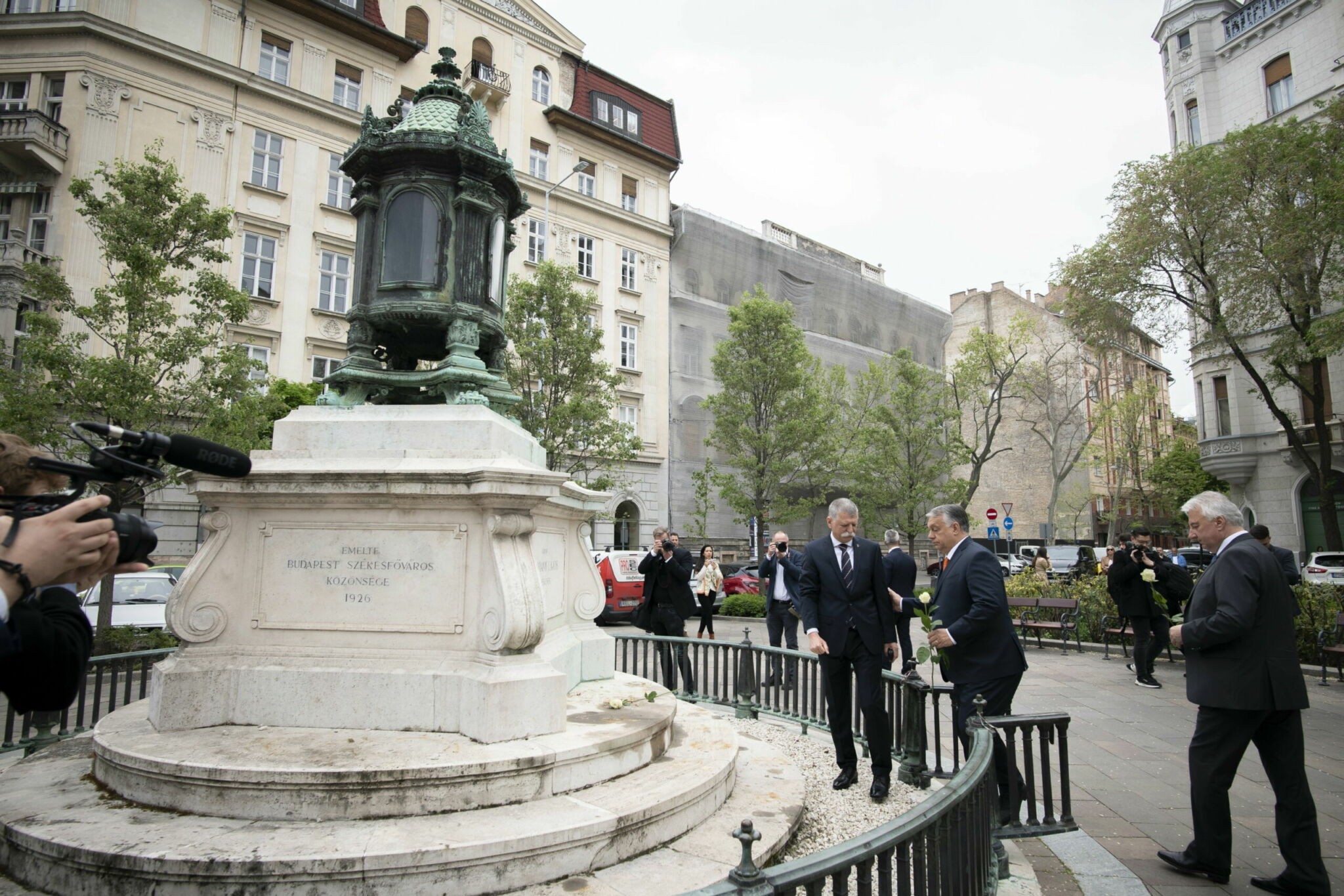Orbán Viktor miniszterelnök (j2), Semjén Zsolt miniszterelnök-helyettes (j) és Kövér László, az Országgyűlés elnöke (j3) virágot helyez el a Batthyány-örökmécsesnél, Budapesten 2022. május 2-án, az új Országgyűlés alakuló ülése előtt. Forrás: MTI/Miniszterelnöki Sajtóiroda/Benko Vivien Cher