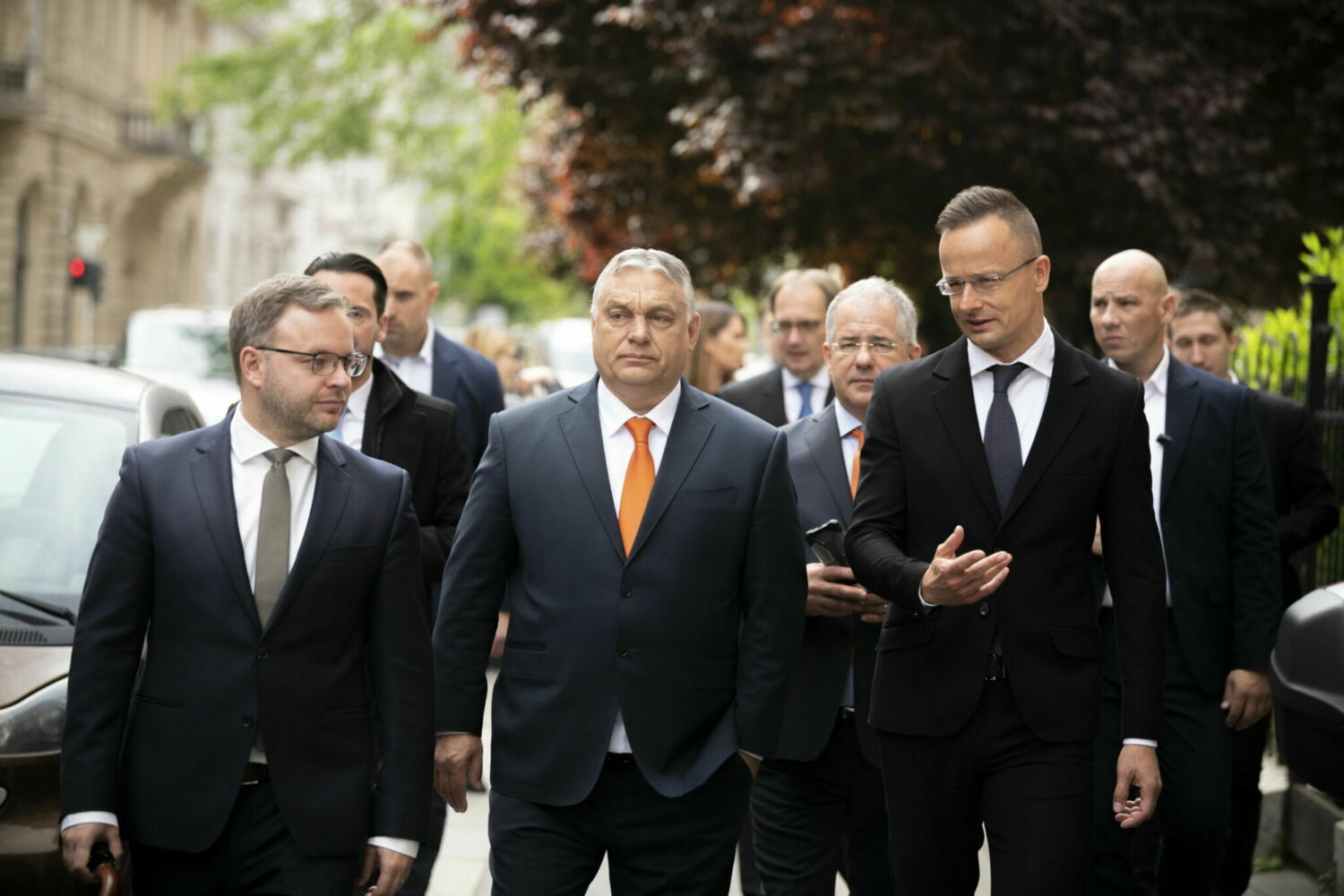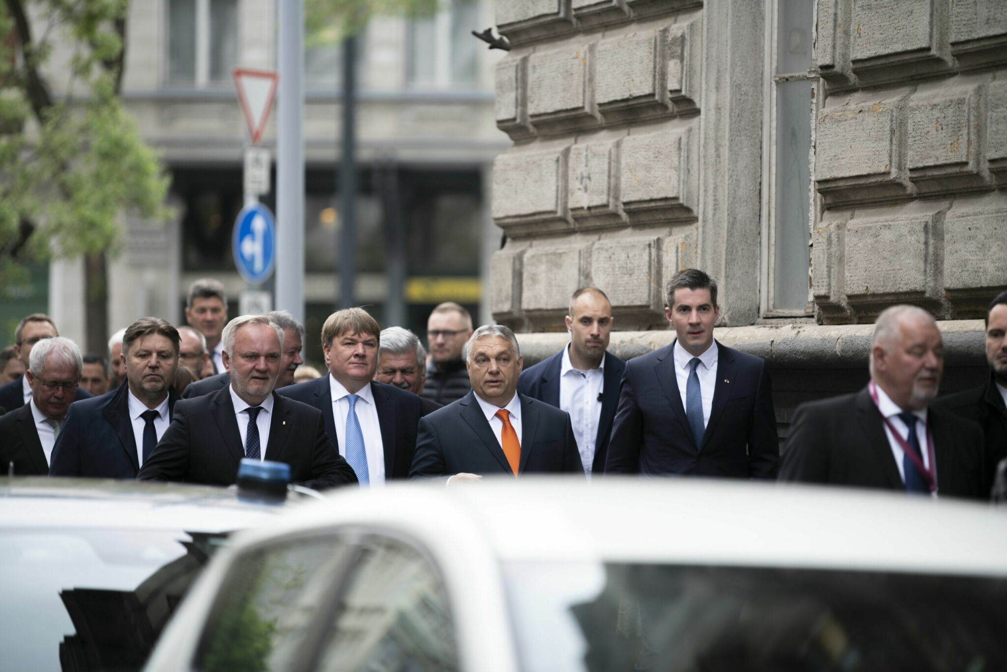 Orbán Viktor miniszterelnök (k), illetve a Fidesz és a KDNP országgyűlési frakcióinak képviselői istentiszteletre mennek a Hold utcai református templomba, Budapesten 2022. május 2-án, az új Országgyûlés alakuló ülése elõtt. A kormányfő mellett jobbra Kocsis Máté, a Fidesz frakcióvezetője (j3). Forrás: MTI/Benko Vivien Cher