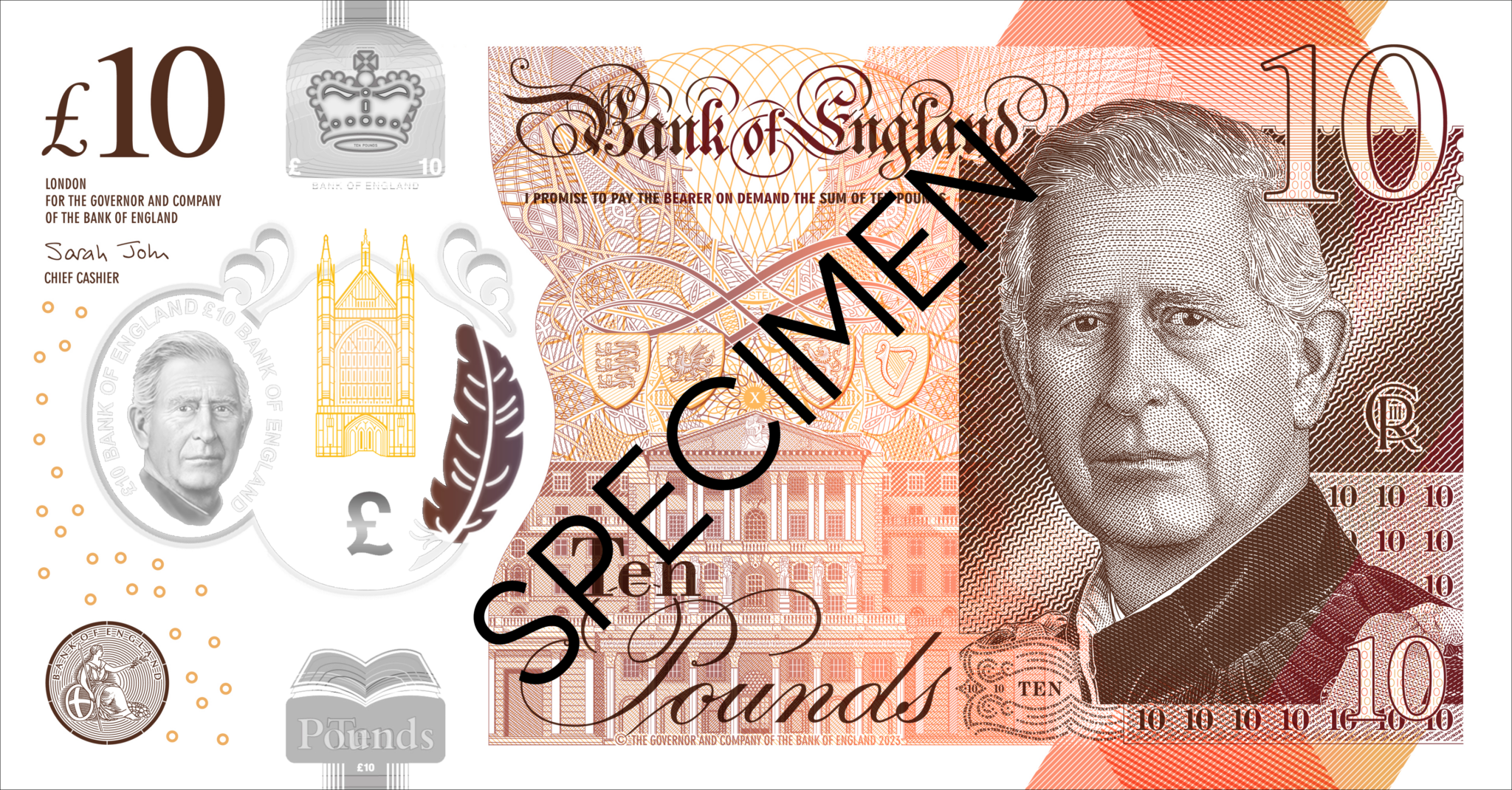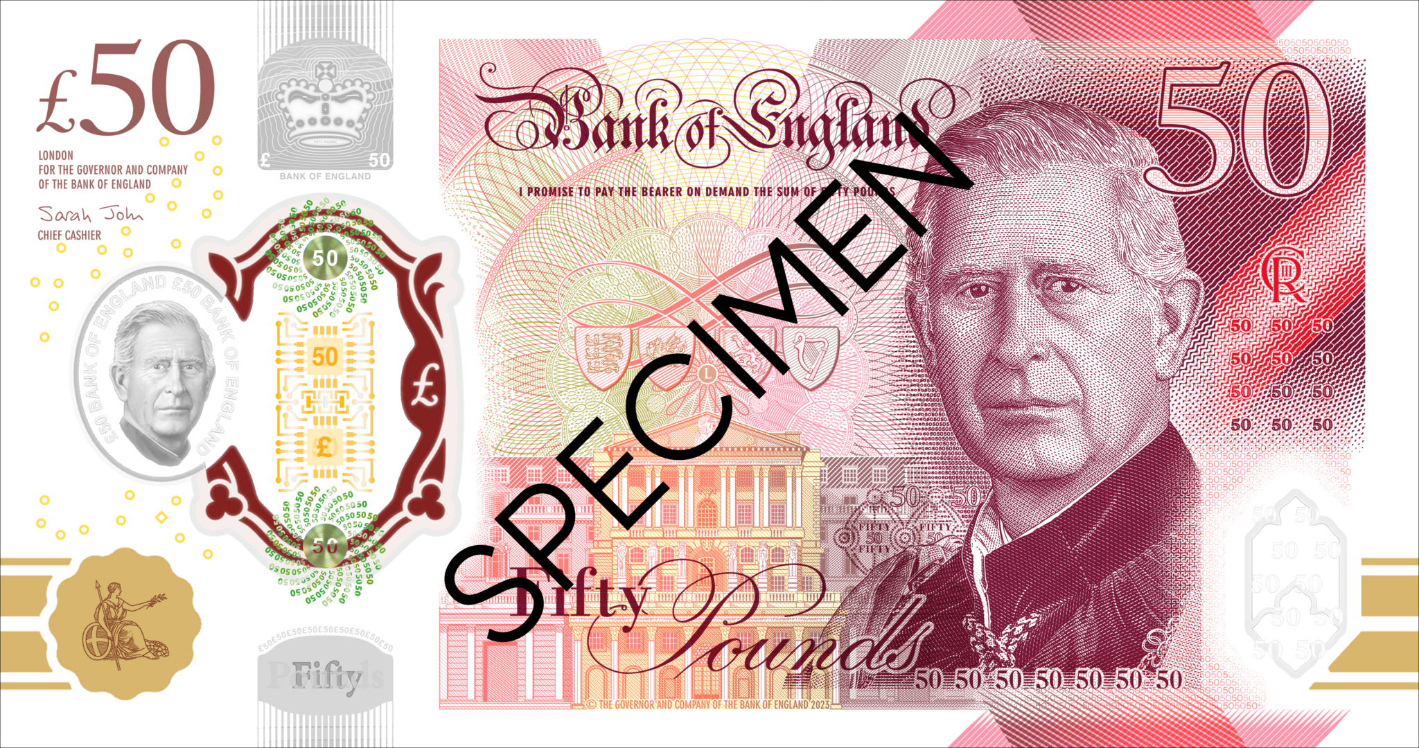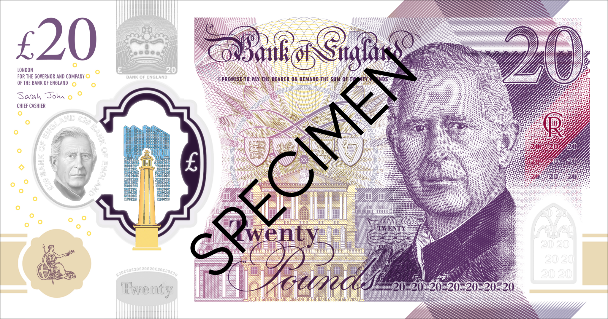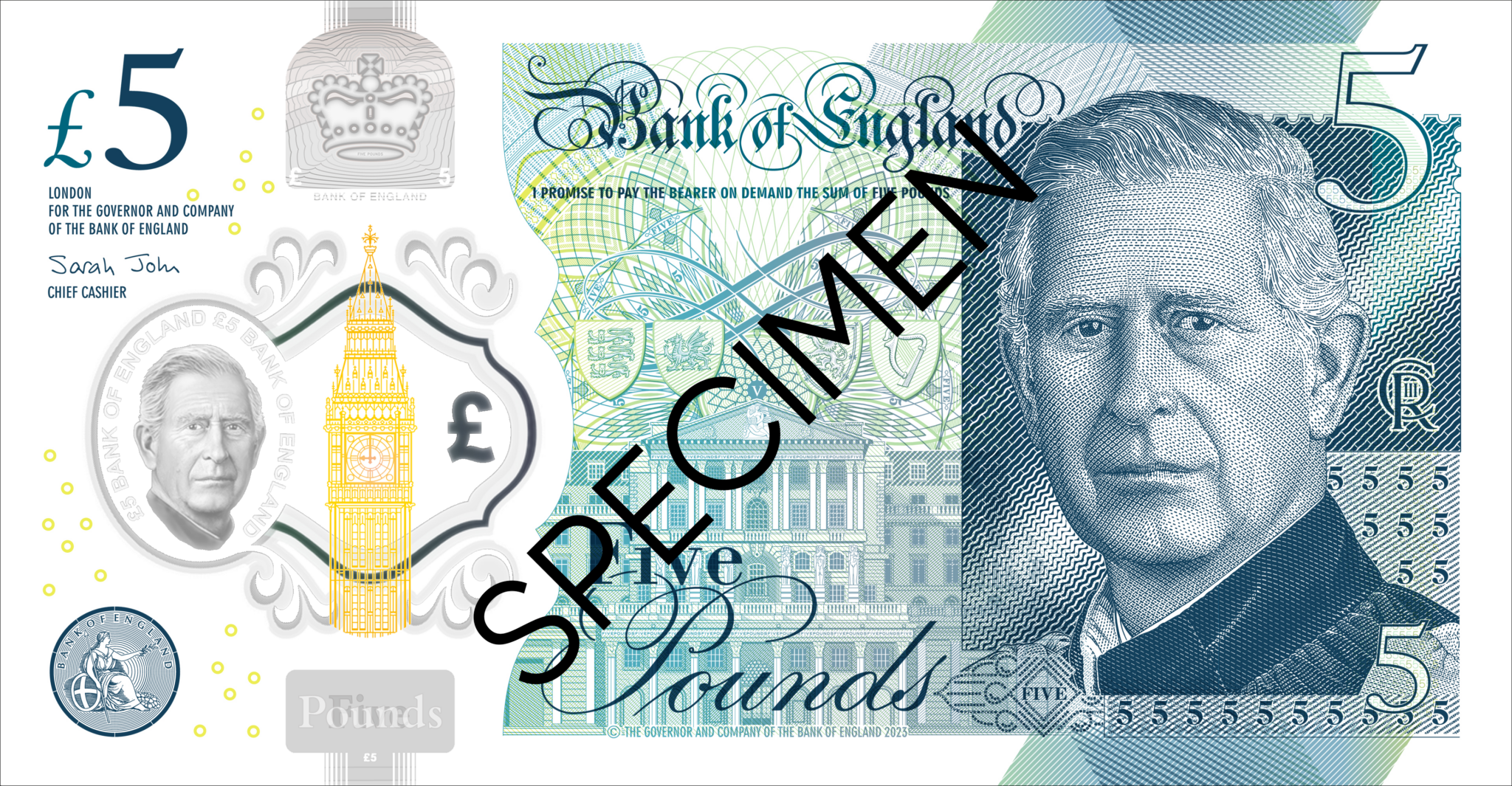 Az új öt-, tíz, húsz- és ötvenfontos, polimerből készült bankjegyek előlapján a bankjegyek hamisítását nehezítő, áttetsző „biztonsági ablakon” lesz látható Károly arcképe, ettől eltekintve a bankók ugyanolyanok maradnak, mint amelyeken Erzsébet királynő látható.