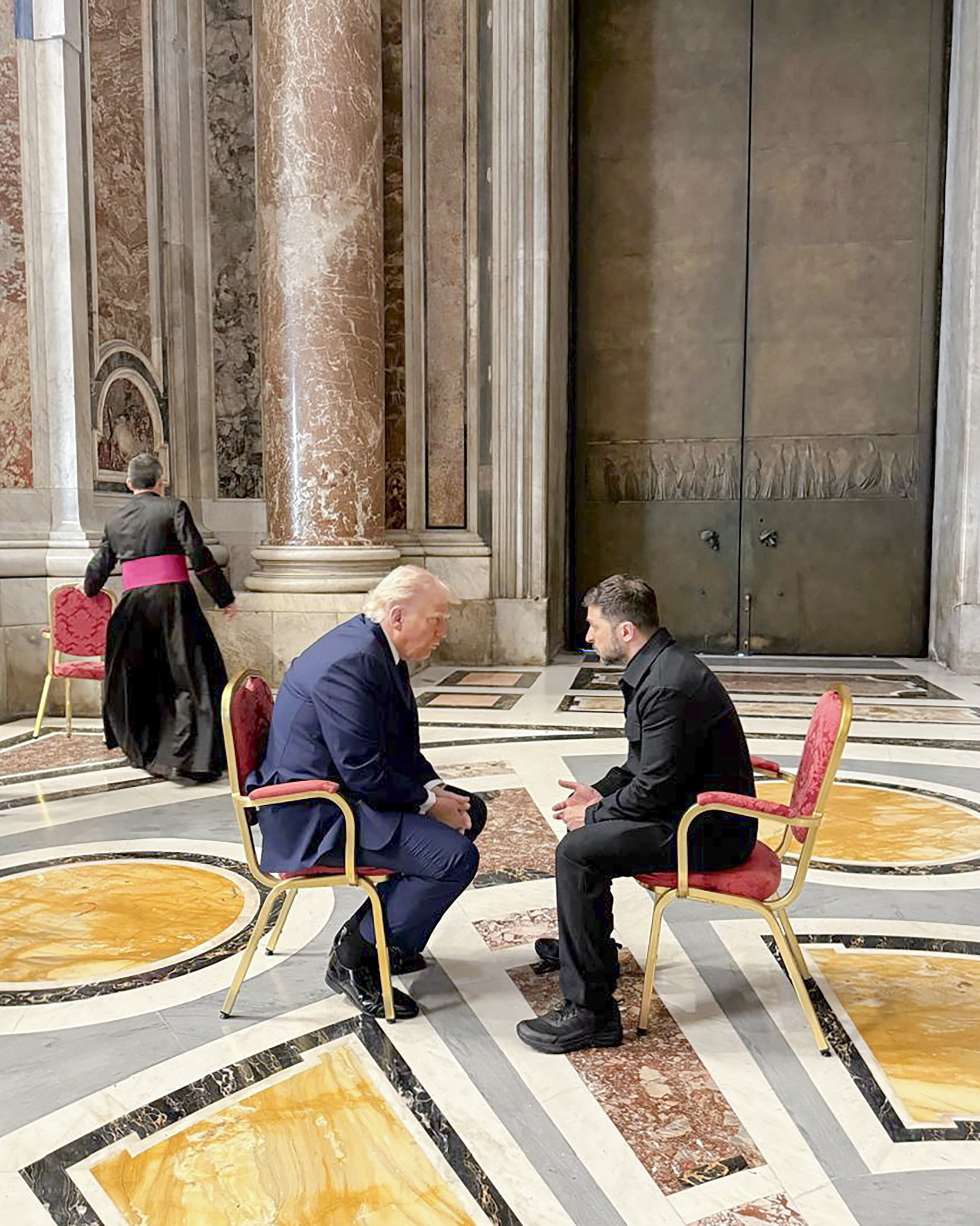 Vezetőkép: Volodimir Zelenszkij ukrán (j) és Donald Trump amerikai elnök beszélget a vatikáni Szent Péter-bazilikában Ferenc pápa gyászszertartása idején, 2025. április 26-án. Fotó: MTI/EPA/Ukrán elnöki sajtószolgálat