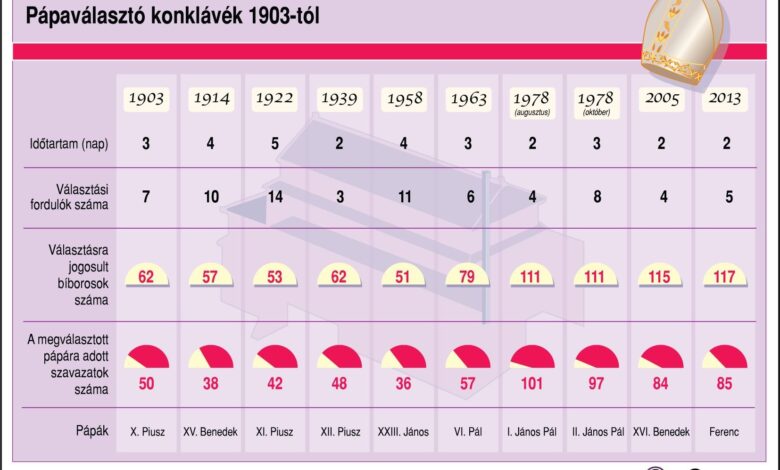 Vezetőkép: Pápaválasztó konklávék 1903-tól. 1903, X. Piusz; 1914, XV. Benedek; 1922, XI. Piusz; 1939, XII.Piusz; 1958, XXIII. János; 1963, VI. Pál; 1978. augusztus, I. János Pál; 1978. október, II. János Pál; 2005, XVI. Benedek; Ferenc; időtartam (nap); választási fordulók száma; választásra jogosult bíborosok száma; a megválasztott pápára adott szavazatok száma; pápák. Forrás: MTI