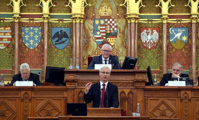 Vezetőkép: Soltész Miklós, a Miniszterelnökség egyházi és nemzetiségi kapcsolatokért felelős államtitkára beszédet mond a VI. Nemzetiségi önkormányzati fenntartású nemzetiségi köznevelési intézmények parlamenti találkozóján az Országházban 2025. május 8-án. Fotó: MTI/Kovács Attila