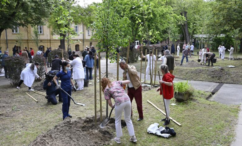 Vezetőkép: Fákat és virágokat ültetnek a Dél-pesti Centrumkórház, a Porsche Hungaria és a B+N Referencia Zrt. munkatársai a Dél-pesti Centrumkórház Onkológiai Rehabilitációs Osztályának kertjében 2025. május 17-én. Fotó: MTI/Lakatos Péter