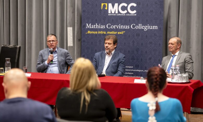 Vezetőkép: Horváth László, a kábítószer-kereskedelem felszámolásáért felelős kormánybiztos, Haller József neurobiológus, a Drogkutató Intézet igazgatója és Győrfi Pál, az Országos Mentőszolgálat szóvivője a Mathias Corvinus Collegium (MCC) gyöngyösi kábítószer-prevenciós kerekasztal-beszélgetésén 2025. május 16-án. Fotó: MTI/Komka Péter