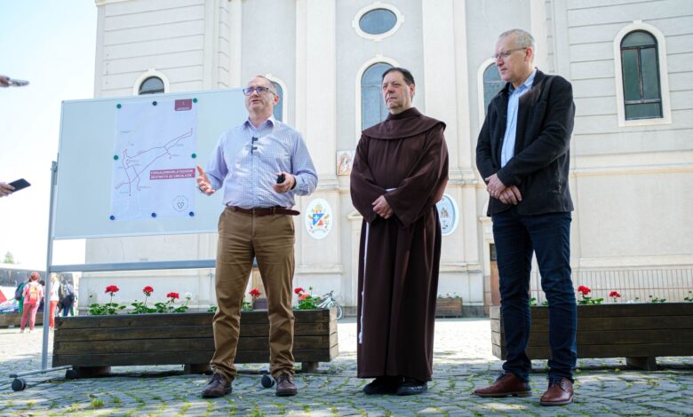 Vezetőkép: Korodi Attila, Csíkszereda polgármestere az idei pünkösdi búcsúról tartott sajtótájékoztatón a csíksomlyói kegytemplom előtti téren 2025. június 5-én. Mellette Timár Sándor P. Asztrik, a kegytemplom igazgatója és Péter György, a Gyulafehérvári Caritas ágazati igazgatója. Fotó: MTI/Veres Nándor