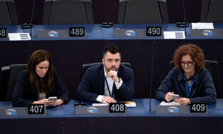 Vezetőkép: Dávid Dóra, Kulja András Tivadar és Gerzsenyi Gabriella (b-j), a Tisza Párt EP-képviselői az Európai Parlament plenáris ülésén Strasbourgban 2024. november 28-án. Fotó: MTI/Bodnár Boglárka