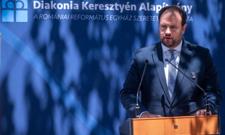 Vezetőkép: Nacsa Lőrinc, a Miniszterelnökség nemzetpolitikai államtitkára beszédet mond a Diakónia Keresztyén Alapítvány által működtetett Jó Testvér Idősotthon átadásán Kolozsváron 2025. július 1-jén. Fotó: MTI/Kiss Gábor