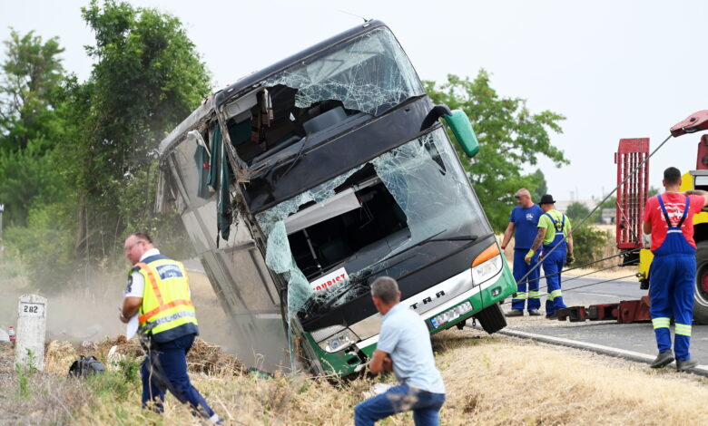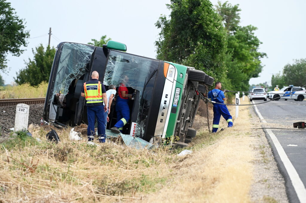 Forrás: MTI. Vezetőkép: Kungyalu, 2025. július 6. Oldalára borult, ukrán rendszámú autóbusz mûszaki mentésén dolgoznak a 442-es fõúton Kunszentmárton és Tiszaföldvár között 2025. július 6-án. A Kungyalu külterületén történt balesetben a busz eddig tisztázatlan körülmények között az árokba hajtott, majd a vasúti töltésnél az oldalára borult. A buszon 77 felnõtt és gyermek utazott. MTI/Mészáros János