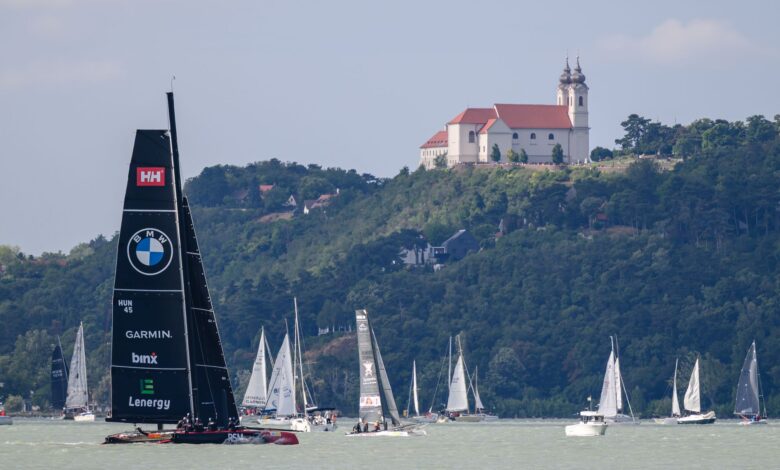 Vezetőkép: Vándor Róbert katamaránja, az RSM az 57. Kékszalag Raiffeisen Nagydíj tókerülő vitorlásverseny rajtja előtt Balatonfüred közelében 2025. július 10-én. MTI/Vasvári Tamás