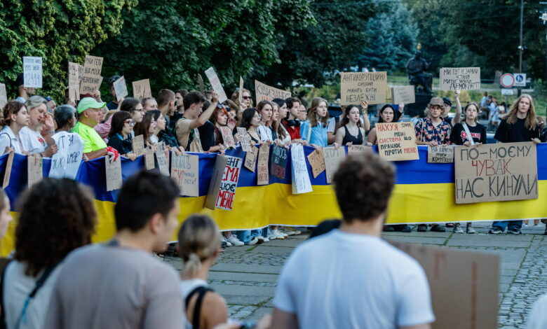 Vezetőkép: A Nemzeti Korrupcióellenes Nyomozóhivatal (NABU) és a Korrupcióellenes Különleges Ügyészség (SZAP) függetlenségét korlátozó törvény ellen tartott, annak eltörlését követelő demonstráció résztvevői az ungvári polgármesteri hivatal előtti Posta téren 2025. július 24-én. Fotó: MTI/Nemes János
