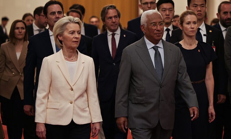 Vezetőkép: António Costa, az Európai Tanács elnöke (elöl, k), Ursula von der Leyen, az Európai Bizottság elnöke és Kaja Kallas, az EU kül-és biztonságpolitikai főképviselője érkezik a 25. alkalommal rendezett Kína-Európai Unió csúcstalálkozó nyitóülésére Pekingben 2025. július 24-én. Fotó: MTI/EPA pool/Andrés Martínez Casares
