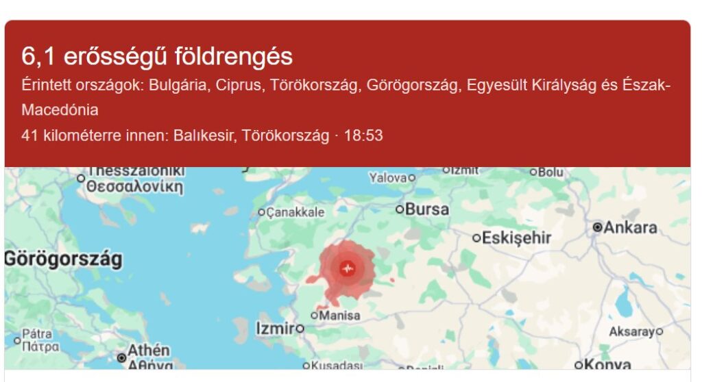 Balıkesir tartományban – török idő szerint 19:53-kor – 6,1 erősségű földrengés következett be. Az első híradások szerint egy épület dőlt össze, az ott élő 6 emberből négyet hoztak ki, kettő kimenekítésén dolgoznak – olvasható a Türkinfo oldalán. Azóta bejelentették, hogy legalább tíz épület omlott össze. Részletekről még nincs híradás. Legalább hárman megsérültek a Törökország nyugati … Bővebben: Földrengés Törökországban, több épület összedőlt, legalább három ember megsérült