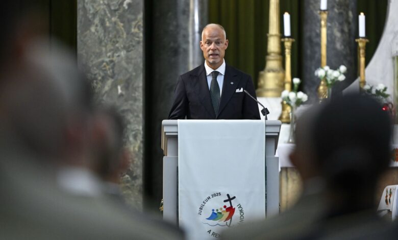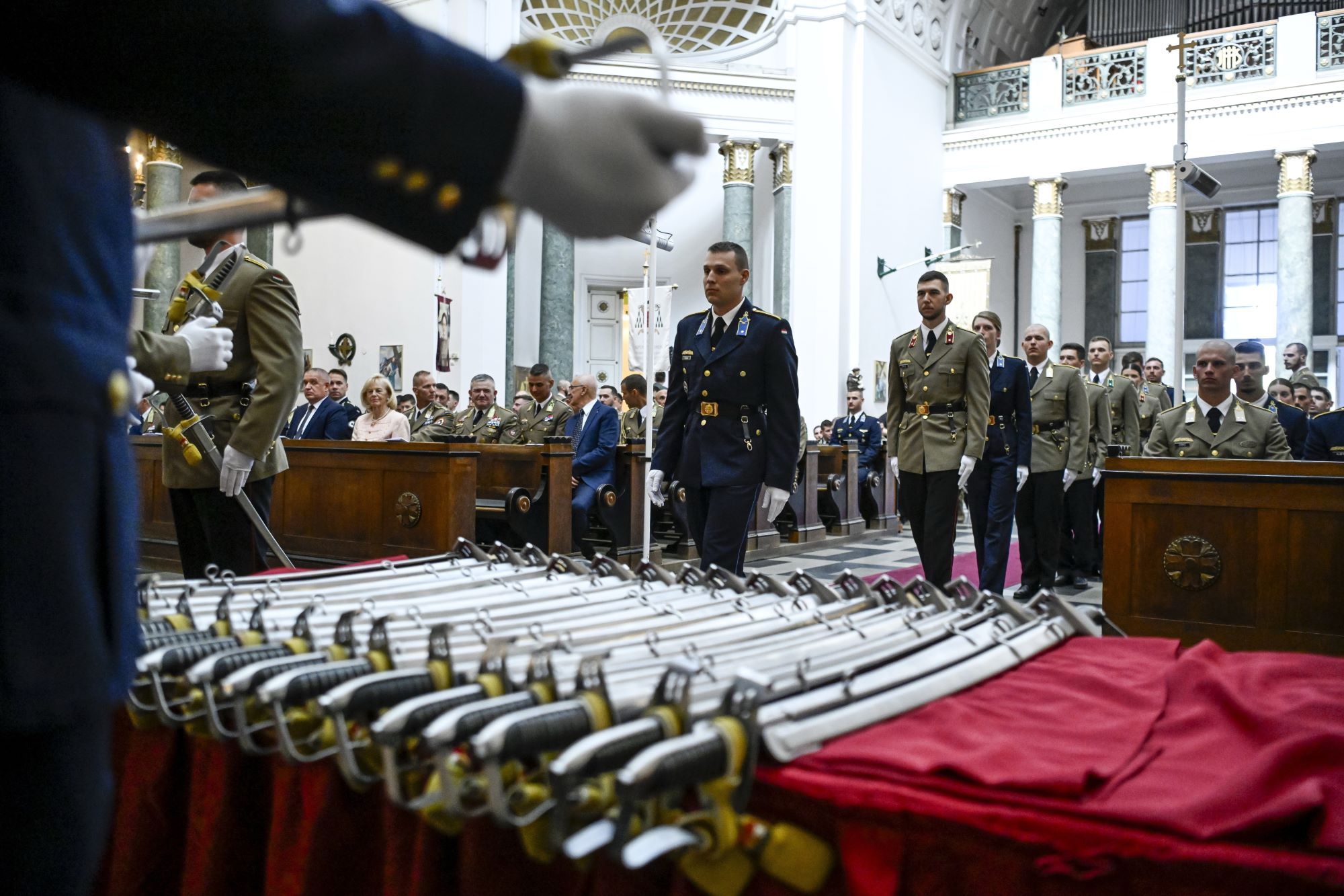 Vezetőkép: Szalay-Bobrovniczky Kristóf honvédelmi miniszter beszédet mond az ifjú honvédtisztek kinevezési ünnepségén, amely a honvédtisztek útba indító díszünnepsége is egyben, Budapesten, a Tisztviselőtelepi Magyarok Nagyasszonya Plébániatemplomban 2025. augusztus 19-én. Fotó: MTI/Purger Tamás