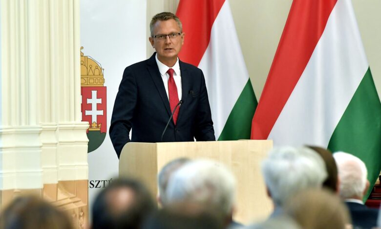 Vezetőkép: Rétvári Bence, a Belügyminisztérium (BM) parlamenti államtitkára beszédet mond az augusztus 20. alkalmából adományozott állami kitüntetések átadásán a minisztériumban 2025. augusztus 19-én. Fotó: MTI/Soós Lajos