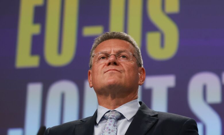 Vezetőkép: Maros Sefcovic, az Európai Bizottság kereskedelemért és gazdasági biztonságért felelős tagja az Európai Unió és az Egyesült Államok közötti kereskedelmi kapcsolatokról tartott brüsszeli sajtóértekezleten 2025. augusztus 21-én. Fotó: MTI/EPA/Olivier Hoslet