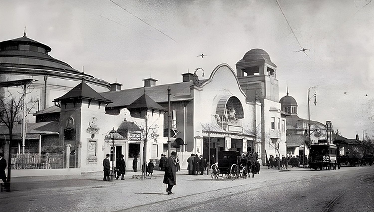 Az épület 1908-ban nyerte el végleges formáját Dénes (Sternberg) Rezső tervei alapján a Mutatványos tér 10. számú parcelláján. Homlokzata a historizáló és a szecessziós stílusjegyek különös találkozását mutatta. A főtömeget egy széles, íves oromzat uralta, közepén félköríves fülkében lovas szoborcsoport állt. Kevesen tudják, de a mozgókép szorosan kapcsolódik a lóhoz a filmtörténet kezdetétől. Eadweard Muybridge 1870–80-as években készített híres fotósorozatai vágtató lovakról bizonyították először, hogy a mozgást képkockák sorozatával lehet rögzíteni és visszaadni. Ezek a kísérletek közvetlenül vezettek a filmtechnika megszületéséhez. Emiatt a ló vágtája a mozgás és a mozi egyik ősi szimbóluma.