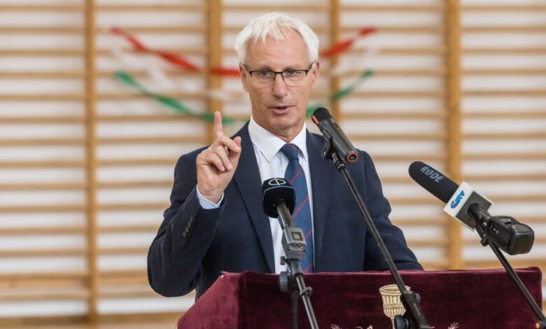 Vezetőkép: Soltész Miklós, a Miniszterelnökség egyházi és nemzetiségi kapcsolatokért felelős államtitkára beszédet mond a csurgói Csokonai Vitéz Mihály Református Gimnázium, Általános Iskola és Kollégium megújult és kibővített tornacsarnokának átadásán 2025. szeptember 11-én. Fotó: MTI/Katona Tibor