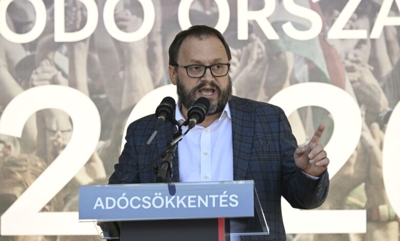 Vezetőkép: Kármán András közgazdász beszédet mond a Tisza Párt kötcsei rendezvényén 2025. szeptember 7-én. Fotó: MTI/Szigetváry Zsolt