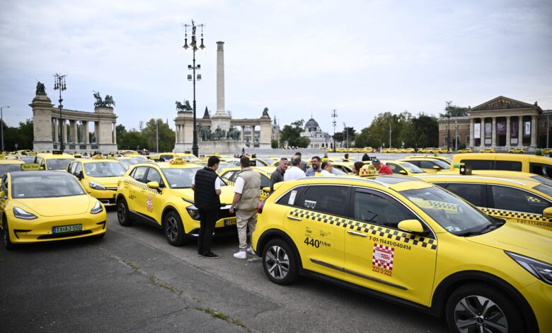 Vezetőkép: A fővárosi taxirendelet tervezett módosítása ellen tiltakozó taxis demonstráció résztvevői a Hősök terén 2025. szeptember 24-én. Fotó: MTI/Bodnár Boglárka.