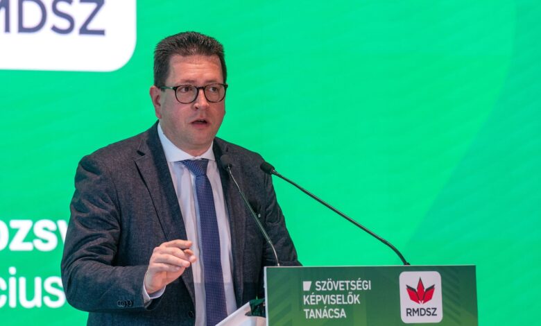 Vezetőkép: Vincze Loránt európai parlamenti képviselő beszédet mond a Romániai Magyar Demokrata Szövetség (RMDSZ) Szövetségi Képviselők Tanácsának (SZKT) kolozsvári ülésén 2025. március 14-én. MTI/Kiss Gábor