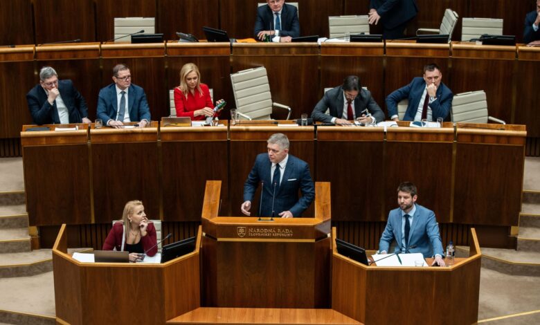 Vezetőkép: Robert Fico szlovák miniszterelnök beszél, mellette Michal Simecka, a legnagyobb szlovák ellenzéki párt, a Progresszív Szlovákia (PS) vezetője a kormány ellen beterjesztett bizalmatlansági indítvány vitáján a parlament pozsonyi üléstermében 2025. január 21-én. Fotó: MTI/EPA/Jakub Gavlak