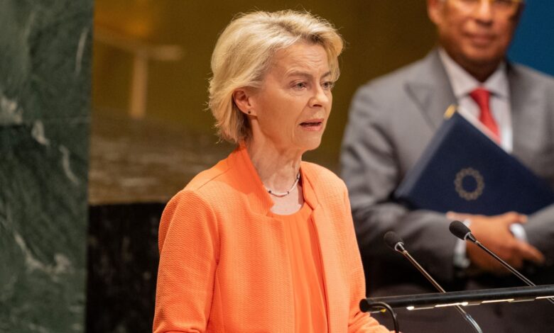 Vezetőkép: Ursula von der Leyen, az Európai Bizottság elnöke felszólal a Franciaország és Szaúd-Arábia által kezdeményezett közel-keleti csúcstalálkozón, az ENSZ-közgyűlés 80. ülésszakán a világszervezet New York-i székházában 2025. szeptember 22-én. Fotó: MTI/EPA/Lev Radin