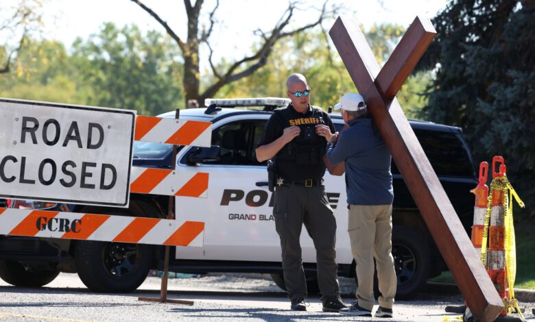Vezetőkép: Rendfenntartóhoz beszél egy görgős talpú fakeresztet cipelő férfi az Utolsó Napi Szentek Jézus Krisztus Egyházának kiégett templománál a Michigan amerikai állambeli Grand Blanc városban 2025. szeptember 29-én. Az előző napon a mormon imaházba hajtott kisteherautóval egy férfi a délelőtti istentisztelet alatt, gépkarabélyból tüzet nyitott a bent tartózkodó hívőkre, majd felgyújtotta az épületet. Fotó: MTI/AP/Carlos Osorio
