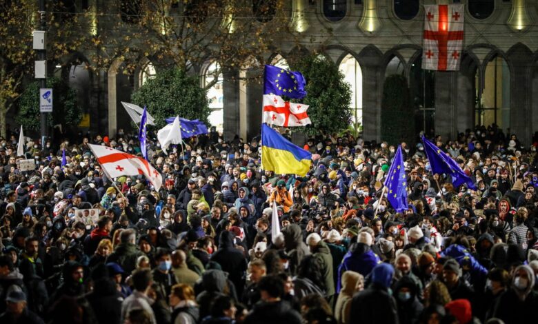 Tüntetők egy csoportja megpróbált behatolni az elnöki palota területére, miután ellenzéki politikusok „békés forradalomra” szólítottak fel a kormányzó Georgiai Álom-Demokratikus Georgia párt ellen. A rendőrség páncélozott járműveket, vízágyút és paprikasprayt vetett be a tömeg visszaszorítására.