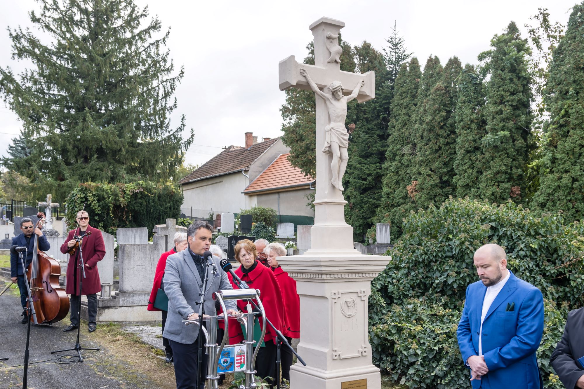 Vezetőkép: Latorcai Csaba, a KDNP alelnöke, a Közigazgatási és Területfejlesztési Minisztérium parlamenti államtitkára beszédet mond az 1914-ben állított kereszt önkormányzati felújítása és újbóli megáldása alkalmából a hévízi temetőben 2025. október 7-én. MTI/Katona Tibor