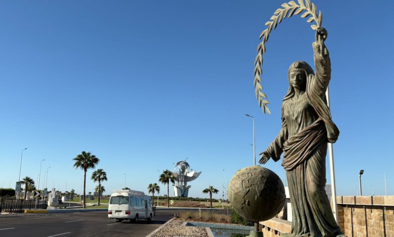 Vezetőkép: A Béke tér szobrai az izraeli és a Hamász palesztin iszlamista szervezet küldöttsége közötti tűzszüneti tárgyalás helyszíne közelében, az egyiptomi Sarm es-Sejk kikötővárosban 2025. október 8-án. A felek október 9-re virradóan megállapodtak a tűzszünet és a túszalku első szakaszáról. Donald Trump amerikai elnök bejelentette, hogy a Hamász igéretet tett a Gázai övezetben fogva tartott izraeli túszok október 13-i átadására. Fotó: MTI/AP
