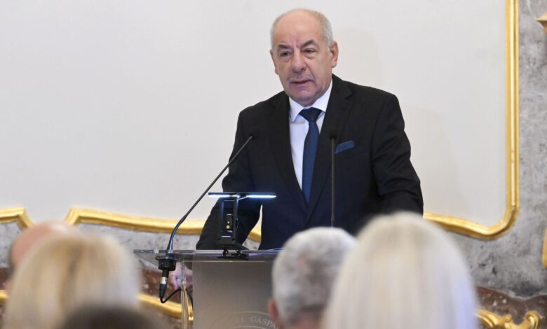 Vezetőkép: Sulyok Tamás köztársasági elnök beszédet mond a magyar polgári közjegyzőség fennállásának 150. évfordulója alkalmából tartott konferencián a budapesti Károlyi-Csekonics-palotában 2025. október 10-én. Fotó: MTI/Bruzák Noémi
