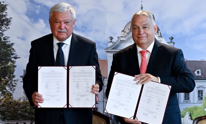 Vezetőkép: Orbán Viktor miniszterelnök és Csányi Sándor, az OTP Bank és a Magyar Agrár- és Élettudományi Egyetem Alapítványának kuratóriumi elnöke, miután aláírta a gödöllői Grassalkovich-kastély átfogó felújítására vonatkozó támogatási együttműködési megállapodást a gödöllői kastély dísztermében 2025. október 13-án. Fotó: MTI/Máthé Zoltán