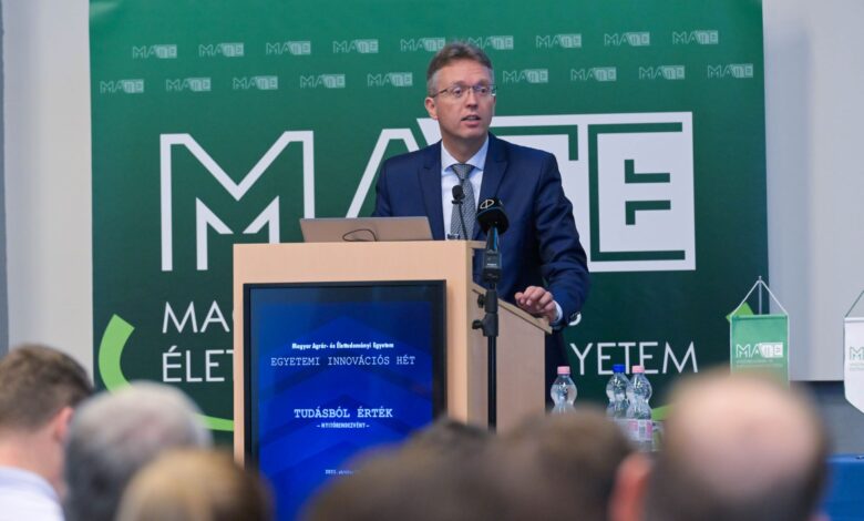 Vezetőkép: Hankó Balázs kultúráért és innovációért felelős miniszter beszédet mond a Magyar Agrár- és Élettudományi Egyetem (MATE) innovációs hetének Tudásból érték című nyitórendezvényén Gödöllőn, a MATE Szent István Campus Tudástranszfer Központjában 2025. október 14-én. Fotó: MTI/Bruzák Noémi