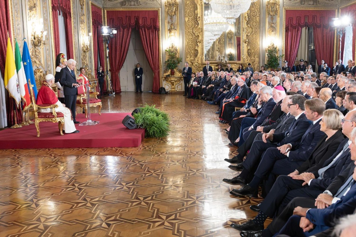 Elnök Úr! Köszönöm kedves szavait és a meghívást a quirinali palotába, amely oly szorosan kapcsolódik a katolikus egyház történetéhez és számos pápa emlékéhez – kezdte beszédét a Szentatya. Róma püspökeként és Olaszország prímásaként jelentős számomra, hogy ezzel a látogatással megújíthatom azt az erős köteléket, amely Péter székét az Ön által képviselt olasz néppel egyesíti, az Olaszország és a Szentszék közötti szívélyes kétoldalú kapcsolatok keretében, amelyeket következetesen őszinte barátság és hatékony kölcsönös együttműködés jellemez.