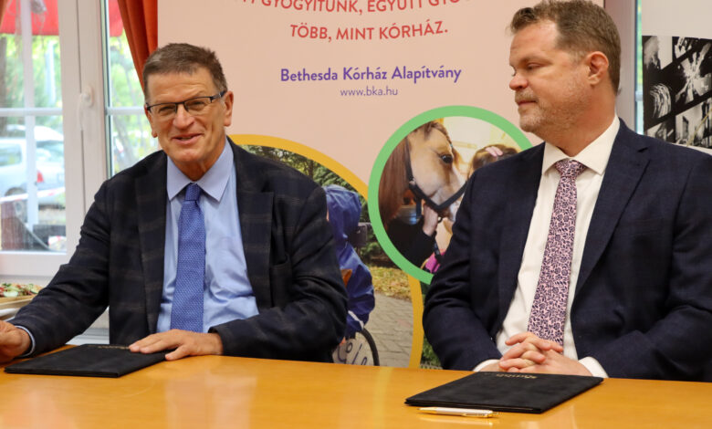 Vezetőkép: Dr. Velkey György János, a Bethesda Gyermekkórház főigazgatója és Koltay András, az NMHH elnöke az ünnepélyes aláíráson 2025. október 14-én. Kép forrása: Bethesda Gyermekkórház
